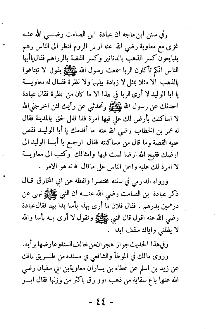 وفي سنن ابن ماجة أن عبادة بن الصامت رضي الله عنه غزا مع معاوية رضي الله عنه أرض الروم فنظر إلى الناس وهم يتبايعون كسر الذهب بالدنانير وكسر الفضة بالدراهم فقال: يا أيها الناس إنكم تأكلون الربا، سمعت رسول الله - صلى الله عليه وسلم - يقول: (لا تبتاعوا الذهب بالذهب إلا مثلا بمثل لا زيادة بينهما ولا نظرة) فقال له معاوية: يا أبا الوليد لا أرى الربا في هذا إلا ماكان من نظرة، فقال عبادة: أحدثك عن رسول الله - صلى الله عليه وسلم - وتحدثني عن رأيك، لئن أخرجني الله، لا أساكنك بأرض لك علي فيها إمرة. فلما قفل لحق بالمدينة فقال له عمر بن الخطاب رضي الله عنه: ما أقدمك يا أبا الوليد فقص عليه القصة، وما قال من مساكنته فقال ارجع يا أبا الوليد إلى أرضك فقبح الله أرضا لست فيها وأمثالك وكتب إلى معاوية: لا إمرة لك عليه، واحمل الناس على ما قال فإنه هو الأمر.