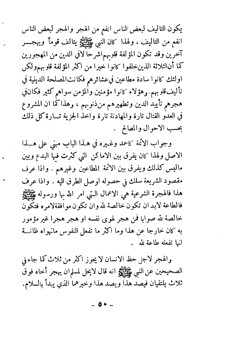 ولهذا كان النبي - صلى الله عليه وسلم - يتألف قوما ويهجر قوما آخرين، وقد تكون المؤلفة قلوبهم أشر حالا في الدين من المهجورين، كما أن الثلاثة الذين خلفوا كانوا خيرا من أكثر المؤلفة قلوبهم ولكن أولئك كانوا سادة مطاعين في عشائرهم فكانت المصلحة الدينية في تأليف قلوبهم. وهؤلاء كانوا مؤمنين، والمؤمنون سواهم كثير فكان في هجرهم تأييد الدين وتطهيرهم من ذنوبهم، وهذا كما أن المشروع في العدو القتال تارة والمهادنة تارة وأخذ الجزية تارة، كل ذلك بحسب الأحوال والمصالح.
