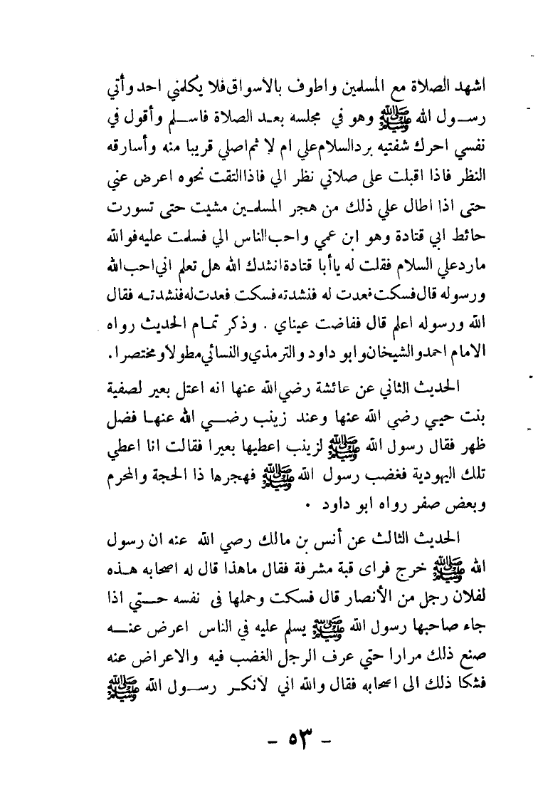 أشهد الصلاة مع المسلمين وأطوف بالأسواق فلا يكلمني أحد وآتي رسول الله - صلى الله عليه وسلم - وهو في مجلسه بعد الصلاة فأسلم وأقول في نفسي أحرك شفتيه برد السلام علي أم لا ثم أصلّي قريبا منه وأسارقه النظر فإذا أقبلت على صلاتي نظر إلي فإذا التفت نحوه أعرض عني حتى إذا طال علي ذلك من هجر المسلمين مشيت حتى تسورت حائط أبي قتادة وهو ابن عمي وأحب الناس إلي فسلمت عليه فوالله ما رد علي السلام فقلت له يا أبا قتادة أنشدك الله هل تعلم أني أحب الله ورسوله قال فسكت فعدت له فنشدته فسكت فعدت له فنشدته فقال: الله ورسوله أعلم قال: ففاضت عيناي. وذكر تمام الحديث رواه الإمام أحمد والشيخان وأبو داود والترمذي والنسائي مطولا ومختصرا.