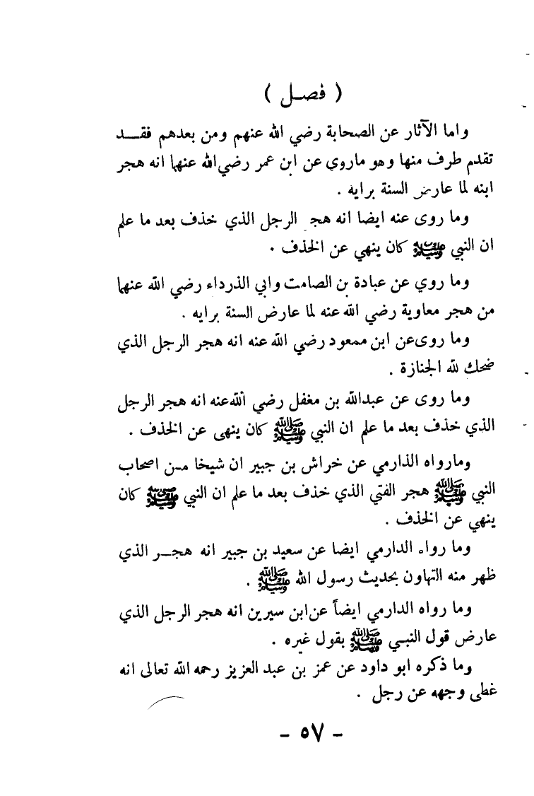 وما روي عن عبد الله بن مغفل رضي الله عنه أنه هجر الرجل الذي خذف بعدما علم أن النبي - صلى الله عليه وسلم - كان ينهى عن الخذف، وما رواه الدارمي عن خراش بن جبير أن شيخا من أصحاب النبي - صلى الله عليه وسلم - هجر الفتى الذي خذف بعدما علم أن النبي - صلى الله عليه وسلم - كان ينهى عن الخذف، وما رواه الدارمي أيضا عن سعيد بن جبير أنه هجر الذي ظهر منه التهاون بحديث رسول الله - صلى الله عليه وسلم -. وما رواه الدارمي أيضا عن ابن سيرين أنه هجر الرجل الذي عارض قول النبي - صلى الله عليه وسلم - بقول غيره.