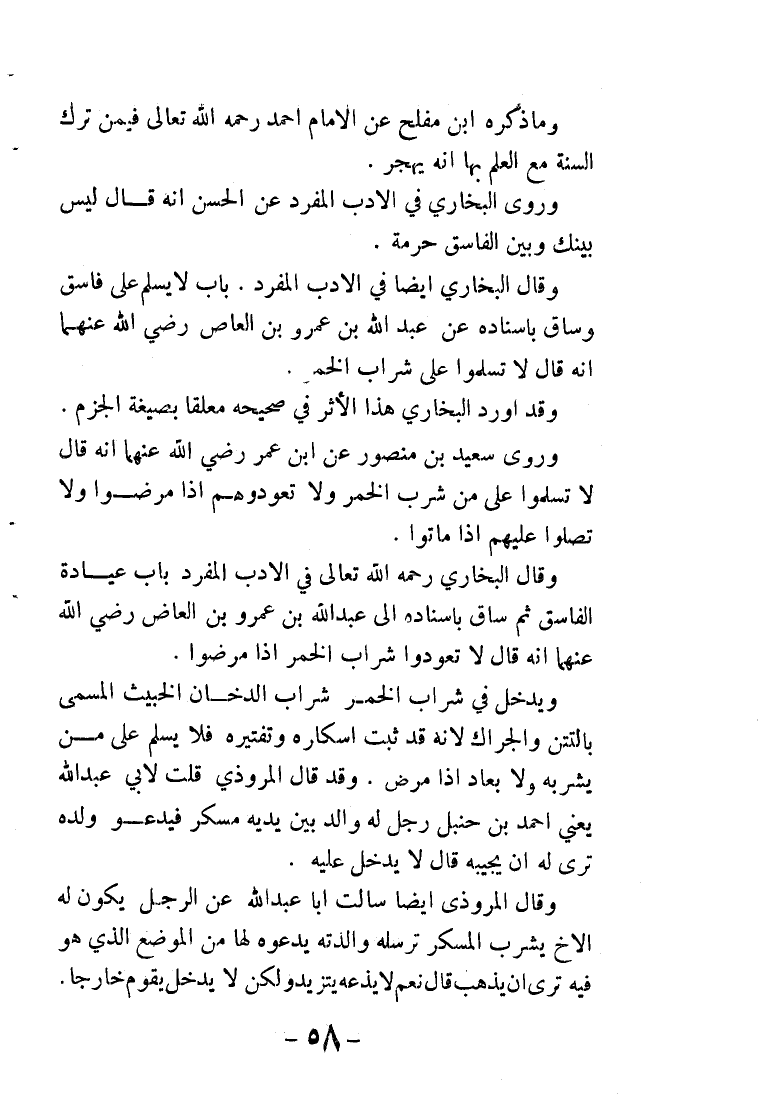 وروى البخاري في الأدب المفرد عن الحسن أنه قال: ليس بينك وبين الفاسق حرمة. وقال البخاري أيضا في الأدب المفرد: (باب: لا يسلم على فاسق) وساق عن عبد الله بن عمرو بن العاص رضي الله عنهما قال: لا تسلموا على شراب الخمر. وقد أورد البخاري رحمه الله تعالى هذا الأثر معلقا بصيغة الجزم.