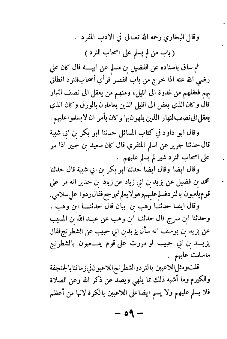 وقال أيضا حدثنا أبو بكر بن أبي شيبة قال: حدثنا محمد بن فضيل عن يزيد بن أبي زياد عن زياد بن حدير أنه مر على قوم يلعبون بالنرد فسلم عليهم وهو لا يعلم ثم رجع فقال: ردوا علي سلامي.