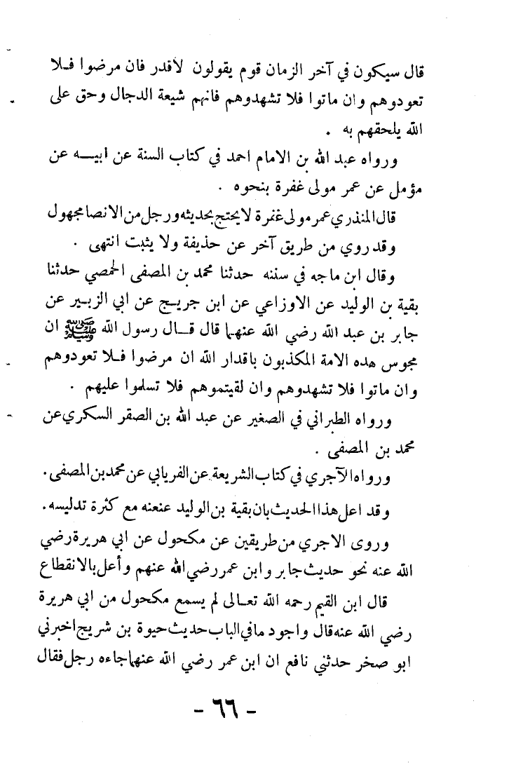 وقال ابن ماجة في سننه حدثنا محمد بن المصفى الحمصي حدثنا بقية بن الوليد عن الأوزاعي عن ابن جريج عن أبي الزبير عن جابر بن عبد الله رضي الله عنهما قال: قال رسول الله - صلى الله عليه وسلم -: (إن مجوس هذه الأمة المكذبون بأقدار الله، إن مرضوا فلا تعودوهم وإن ماتوا فلا تشهدوهم وإن لقيتموهم فلا تسلموا عليهم). ورواه الطبراني في الصغير عن عبد الله بن الصقر السكري عن محمد بن المصفى. ورواه الآجري في كتاب الشريعة عن الفريابي عن محمد بن المصفى، وقد أعل هذا الحديث بأن بقية بن الوليد عنعنه مع كثرة تدليسه.