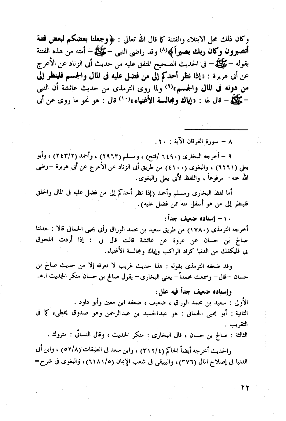 وكان ذلك محل الابتلاء والفتنة كما قال الله تعالى: {وَجَعَلْنَا بَعْضَكُمْ لِبَعْضٍ فِتْنَةً أَتَصْبِرُونَ وَكَانَ رَبُّكَ بَصِيرًا} (¬8) وقد راضى النبي - صلى الله عليه وسلم - أمته من هذه الفتنة بقوله - صلى الله عليه وسلم - في الحديث الصحيح المتفق عليه من حديث أبي الزناد عن الأعرج عن أبي هريرة: "إذا نظر أحدكم إلى من فضل عليه في المال والجسم فلينظر إلى من دونه في المال والجسم" (¬9) ولما روى الترمذي من حديث عائشة أن النبي - صلى الله عليه وسلم - قال لها: "إياك ومجالسة الأغنياء" (¬10) قال: هو نحو ما روى عن أبي
