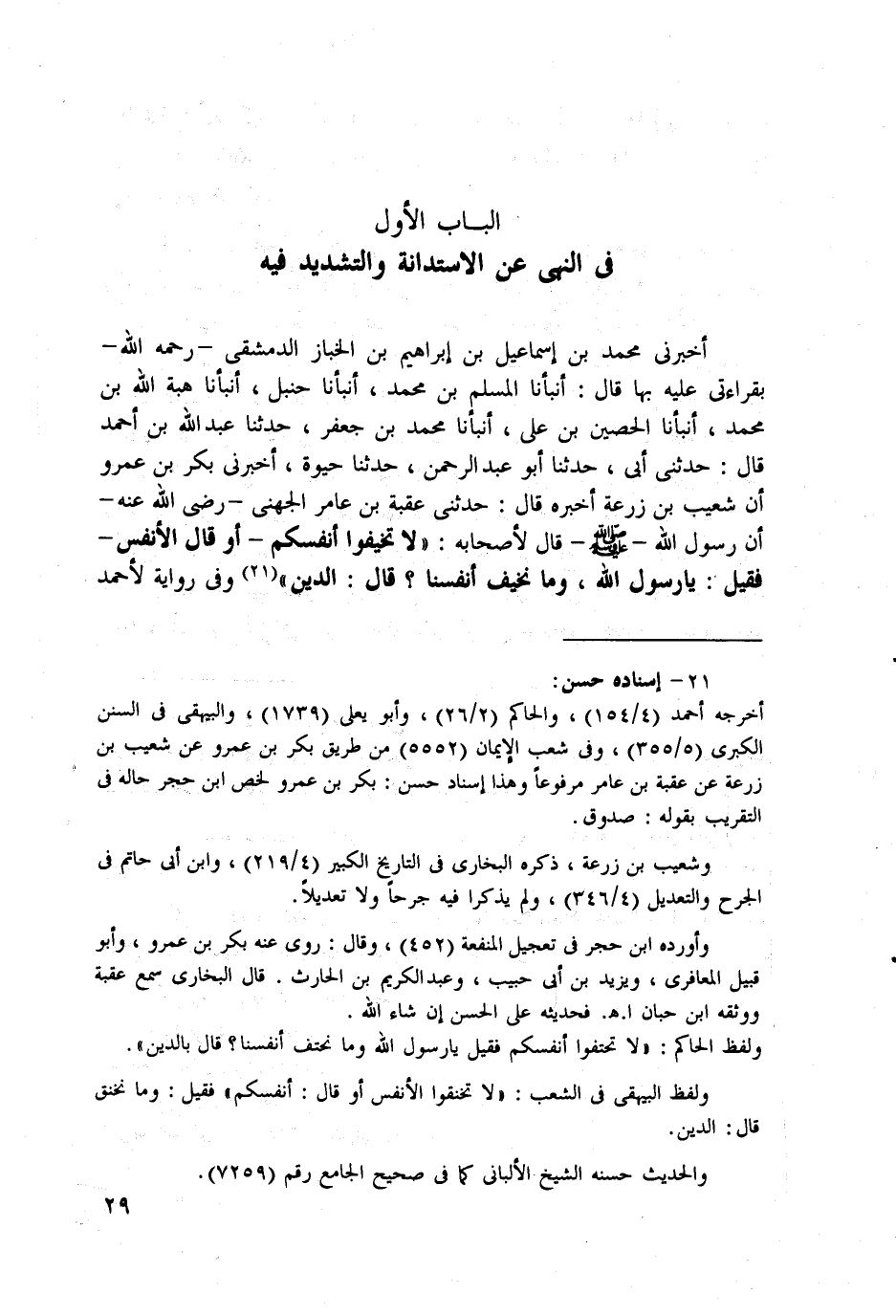 أخبرني محمد بن إسماعيل بن إبراهيم بن الخباز الدمشقي -رحمه الله- بقراءتي عليه بها قال: أنبأنا المسلم بن محمد، أنبأنا حنبل، أنبأنا هبة الله بن محمد، أنبأنا الحصين بن علي، أنبأنا محمد بن جعفر، حدثنا عبد الله بن أحمد قال: حدثني أبي، حدثنا أبو عبد الرحمن، حدثنا حيوة، أخبرني بكر بن عمرو أن شعيب بن زرعة أخبره قال: حدثني عقبة بن عامر الجهني -رضي الله عنه- أن رسول الله - صلى الله عليه وسلم - قال لأصحابه: "لا تخيفوا أنفسكم -أو قال الأنفس- فقيل": يا رسول الله، وما نخيف أنفسنا؟ قال: الدين" (¬21) وفي رواية لأحمد
