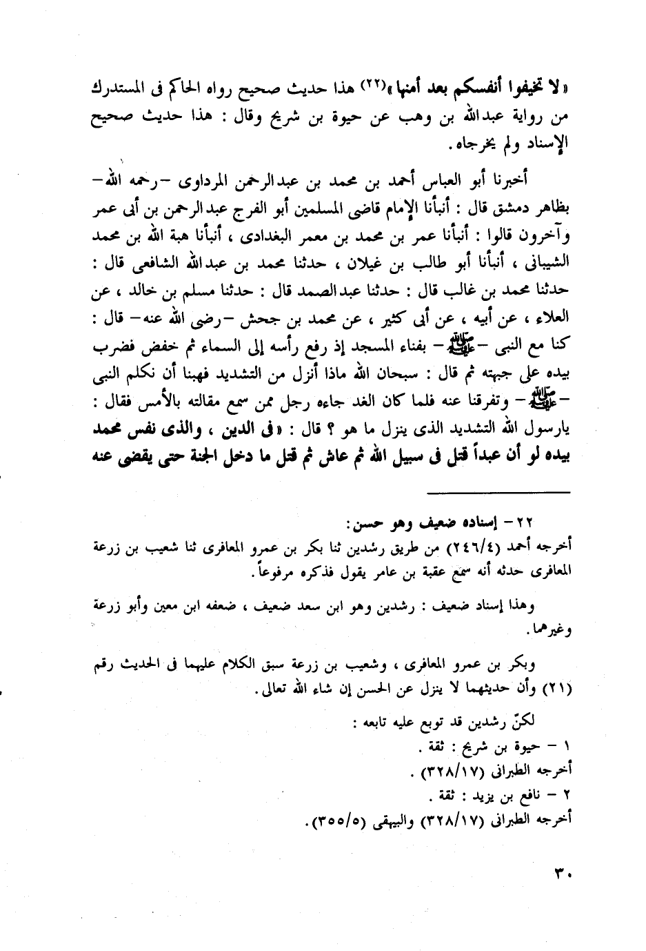 "لا تخيفوا أنفسكم بعد أمنها" (¬22) هذا حديث صحيح رواه الحاكم في المستدرك من رواية عبد الله بن وهب عن حيوة بن شريح وقال: هذا حديث صحيح الإِسناد ولم يخرجاه.