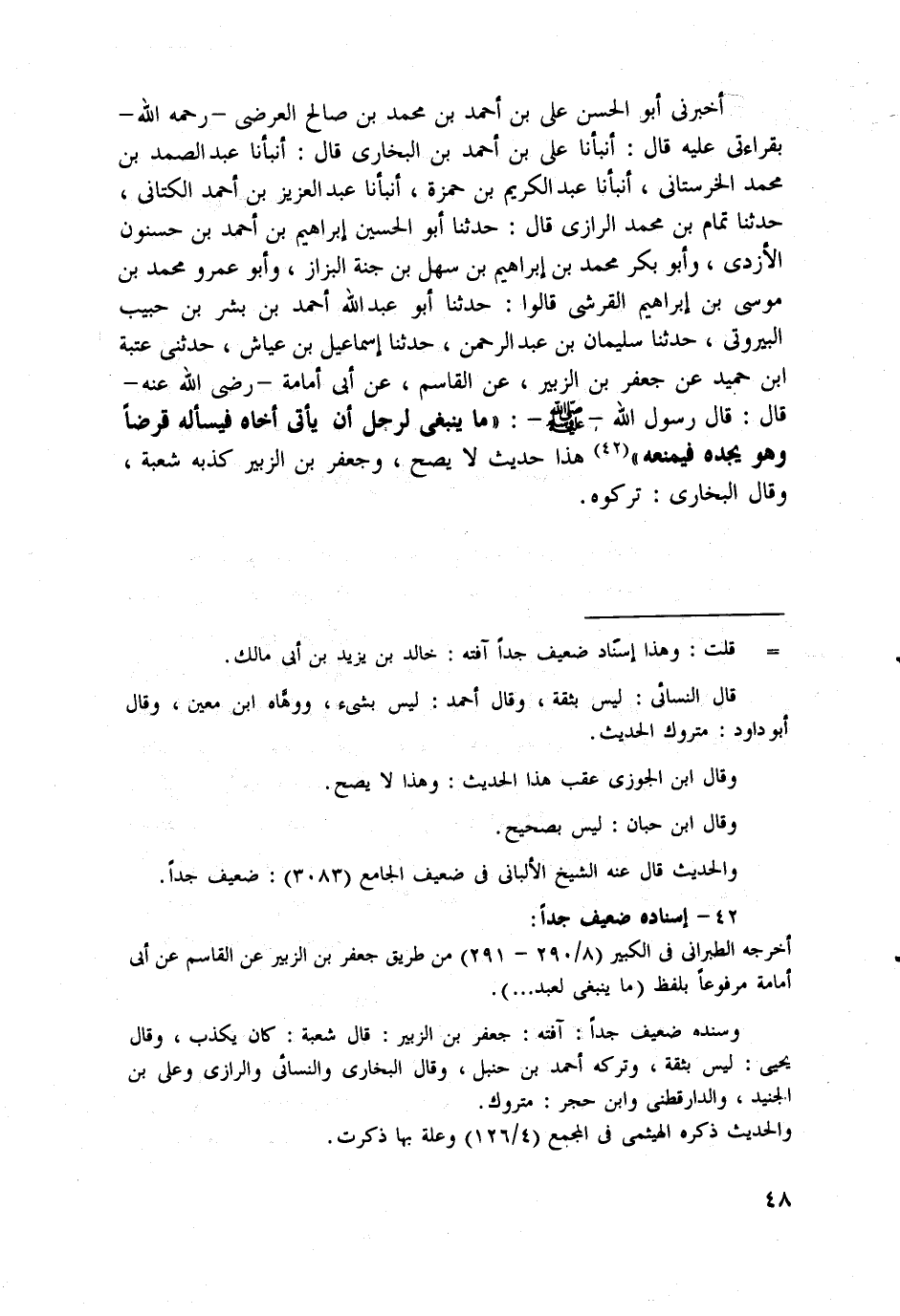 أخبرني أبو الحسن علي بن أحمد بن محمد بن صالح العرضي -رحمه الله- بقراءتي عليه قال: أنبأنا علي بن أحمد بن البخاري قال: أنبأنا عبد الصمد بن محمد الخرستاني، أنبأنا عبد الكريم بن حمزة، أنبأنا عبد العزيز بن أحمد الكتاني، حدثنا تمام بن محمد الرازي قال: حدثنا أبو الحسين إبراهيم بن أحمد بن حسنون الأزدي، وأبو بكر محمد بن إبراهيم بن سهل بن جنة البزاز، وأبو عمرو محمد بن موسى بن إبراهيم القرشي قالوا: حدثنا أبو عبد الله أحمد بن بشر بن حبيب البيروتي، حدثنا سليمان بن عبد الرحمن، حدثنا إسماعيل بن عياش، حدثني عتبة ابن حميد عن جعفر بن الزبير، عن القاسم، عن أبي أمامة -رضي الله عنه- قال: قال رسول الله - صلى الله عليه وسلم -: "ما ينبغي لرجل أن يأتي أخاه فيسأله قرضاً وهو يجده فيمنعه" (¬42) هذا حديث لا يصح، وجعفر بن الزبير كذبه شعبة، وقال البخاري: تركوه.