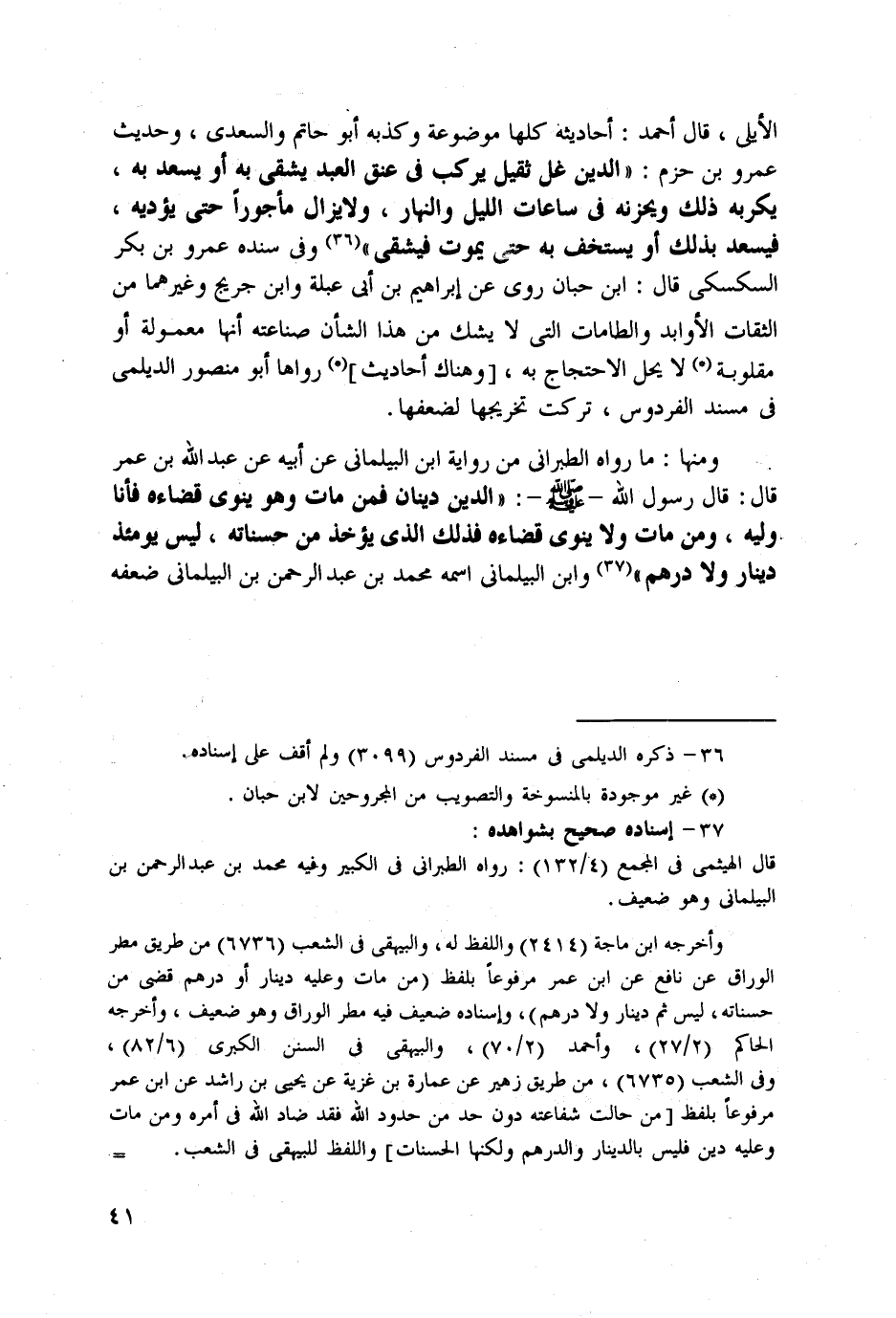 الأيلي، قال أحمد: أحاديثة كلها موضوعة وكذبه أبو حاتم والسعدي، وحديث عمرو بن حزم: "الدين غل ثقيل يركب في عنق العبد يشقى به أو يسعد به، يكربه ذلك ويحزنه في ساعات الليل والنهار، ولا يزال مأجوراً حتى يؤديه، فيسعد بذلك أو يستخف به حتى يموت فيشقى" (¬36) وفي سنده عمرو بن بكر السكسكي قال: ابن حبان روى عن إبراهيم بن أبي عبلة وابن جريج وغيرهما من الثقات الأوابد والطامات التي لا يشك من هذا الشأن صناعته أنها معمولة أو مقلوبة (*) لا يحل الاحتجاج به، [وهناك أحاديث] (*) رواها أبو منصور الديلمي في مسند الفردوس، تركت تخريجها لضعفها.