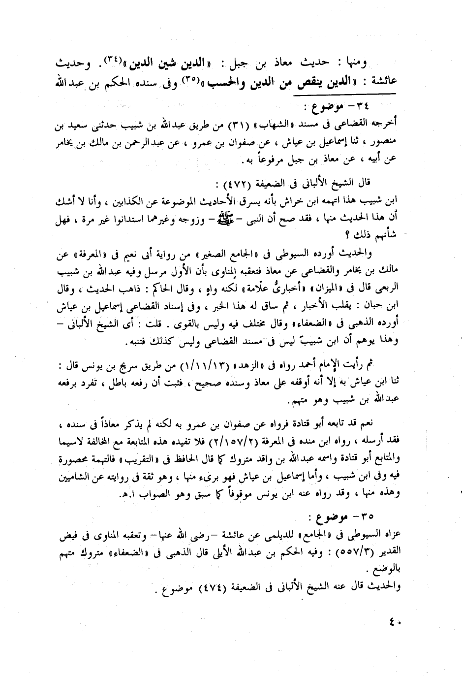 ومنها: حديث معاذ بن جبل: "الدين شين الدين" (¬34). وحديث عائشة: "الدين ينقص من الدين والحسب" (¬35) وفي سنده الحكم بن عبد الله