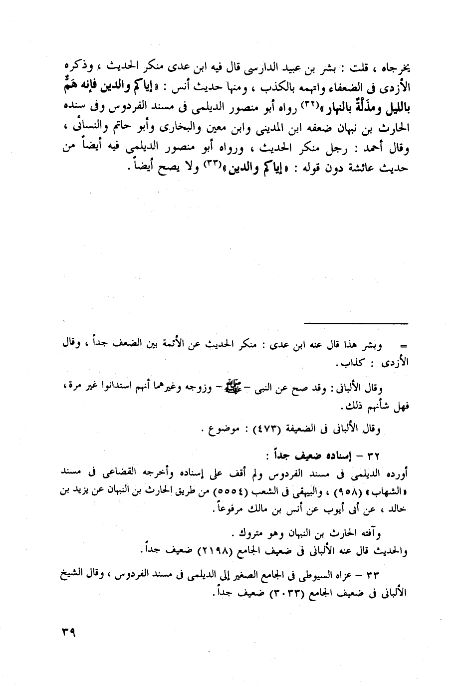 يحرجاه، قلت: بشر بن عبيد الدارسي قال فيه ابن عدي منكر الحديث، وذكره الأزدي في الضعفاء واتهمه بالكذب، ومنها حديث أنس: "إياكم والدين فإنه هَمٌّ بالليل ومذَلَّةٌ بالنهار" (¬32) رواه أبو منصور الديلمي في مسند الفردوس وفي سنده الحارث بن نبهان ضعفه ابن المديني وابن معين والبخاري وأبو حاتم والنسائي، وقال أحمد: رجل منكر الحديث، ورواه أبو منصور الديلمي فيه أيضاً من حديث عائشة دون قوله: "إياكم والدين" (¬33) ولا يصح أيضاً.