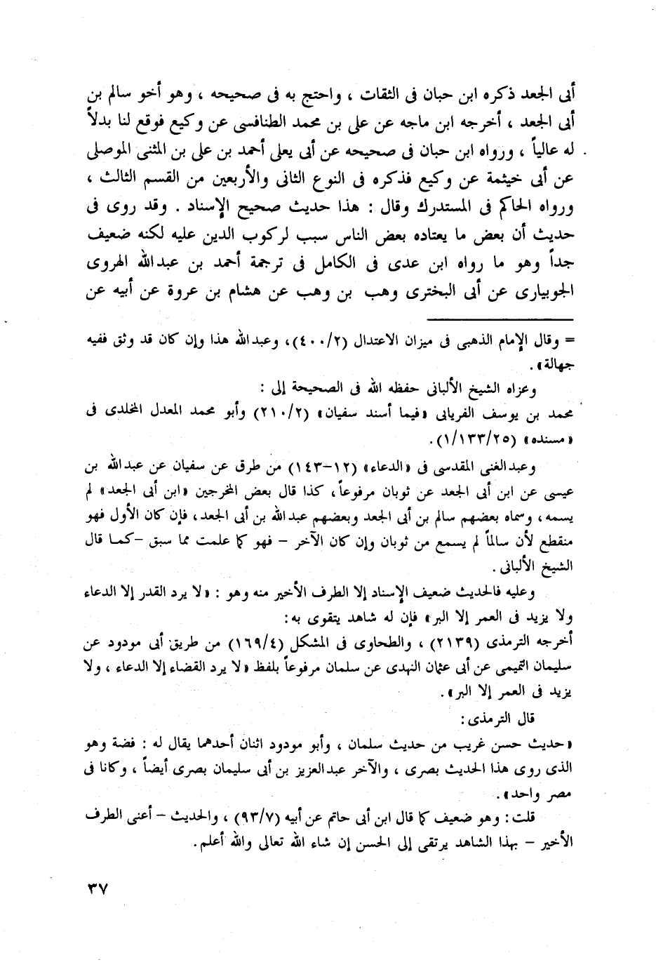 وعبد الغني المقدسي في "الدعاء" ((12) 143) من طرق عن سفيان عن عبد الله بن عيسى عن ابن أبي الجعد عن ثوبان مرفوعاً، كذا قال بعض المخرجين "ابن أبي الجعد" لم يسمه، وسماه بعضهم سالم بن أبي الجعد وبعضهم عبد الله بن أبي الجعد، فإن كان الأول فهو منقطع لأن سالماً لم يسمع من ثوبان وإن كان الآخر -فهو كما علمت مما سبق- كما قال الشيخ الألباني.