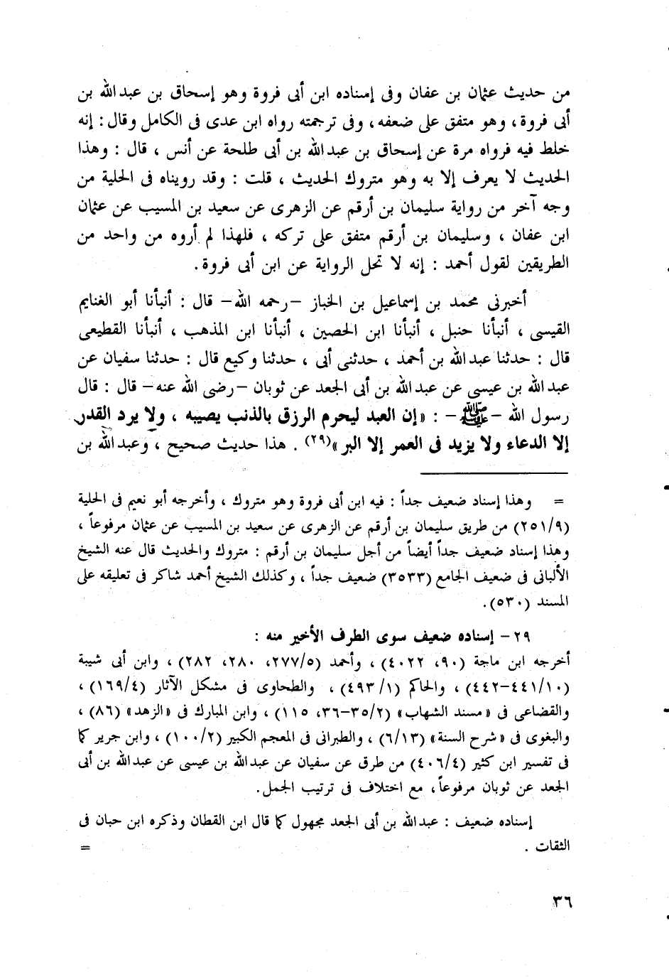 أخبرني محمد بن إسماعيل بن الخباز -رحمه الله- قال: أنبأنا أبو الغنايم القيسي، أنبأنا حنبل، أنبأنا ابن الحصين، أنبأنا ابن المذهب، أنبأنا القطيعي قال: حدثنا عبد الله بن أحمد، حدثني أبي، حدثنا وكيع قال: حدثنا سفيان عن عبد الله بن عيسى عن عبد الله بن أبي الجعد عن ثوبان -رضي الله عنه- قال: قال رسول الله - صلى الله عليه وسلم -: "إن العبد ليحرم الرزق بالذنب يصيبه، ولا يرد القدر، إلا الدعاء ولا يزيد في العمر إلا البر" (¬29). هذا حديث صحيح، وعبد الله بن