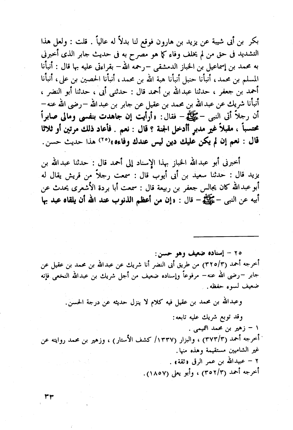 بكر بن أبي شيبة عن يزيد بن هارون فوقع لنا بدلًا له عالياً. قلت: ولعل هذا التشديد في حق من لم يخلف وفاء كما هو مصرح به في حديث جابر الذي أخبرني به محمد بن إسماعيل بن الخباز الدمشقي -رحمه الله- بقراءتي عليه بها قال: أنبأنا المسلم بن محمد، أنبأنا حنبل أنبأنا هبة الله بن محمد، أنبأنا الحصين بن علي، أنبأنا أحمد بن جعفر، حدثنا عبد الله بن أحمد قال: حدثني أبي، حدثنا أبو النضر، أنبأنا شريك عن عبد الله بن محمد بن عقيل عن جابر بن عبد الله -رضي الله عنه- أن رجلًا أتى النبي - صلى الله عليه وسلم - فقال: "أرأيت إن جاهدت بنفسي ومالي صابراً محتسباً، مقبلًا غير مدبرٍ أأدخل الجنة؟ قال: نعم. فأعاد ذلك مرتين أو ثلاثا قال: نعم إن لم يكن عليك دين ليس عندك وفاءه" (¬25) هذا حديث حسن.