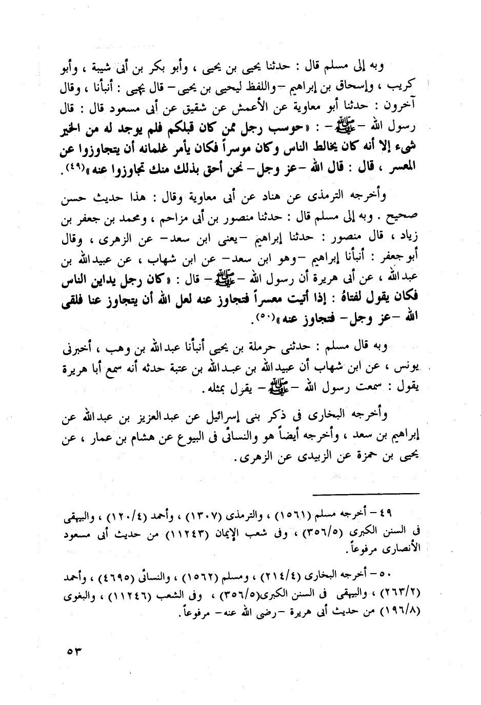 وبه إلى مسلم قال: حدثنا يحيى بن يحيى، وأبو بكر بن أبي شيبة، وأبو كريب، وإسحاق بن إبراهيم -واللفظ ليحيى بن يحيى- قال يحيى: أنبأنا، وقال آخرون: حدثنا أبو معاوية عن الأعمش عن شقيق عن أبي مسعود قال: قال رسول الله - صلى الله عليه وسلم -: "حوسب رجل ممن كان قبلكم فلم يوجد له من الخير شيء إلا أنه كان يخالط الناس وكان موسراً فكان يأمر غلمانه أن يتجاوزوا عن المعسر، قال: قال الله -عز رجل- نحن أحق بذلك منك تجاوزوا عنه" (¬49).