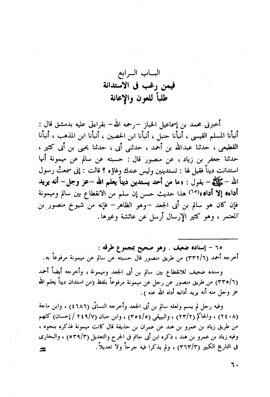 أخبرني محمد بن إسماعيل الخباز -رحمه الله- بقراءتي عليه بدمشق قال: أنبأنا المسلم القيسي، أنبأنا حنبل، أنبأنا ابن الحصين، أنبأنا ابن المذهب، أنبأنا القطيعي، حدثنا عبد الله بن أحمد، حدثني أبي، حدثنا يحيى بن أبي كثير، حدثنا جعفر بن زياد، عن منصور قال: حسبته عن سالم عن ميمونة أنها استدانت ديناً فقيل لها: تستدينين وليس عندك وفاؤه؟ قالت: إني سمعتُ رسول الله - صلى الله عليه وسلم - يقول: "ما من أحد يستدين ديناً يعلم الله -عز رجل- أنه يريد أداءه إلا أداه" (¬65) هذا حديث حسن إن سلم من الانقطاع بين سالم وميمونة فإن كان هو سالم بن أبي الجعد -وهو الظاهر- فإنه من شيوخ منصور بن المعتمر، وهو كثير الإِرسال أرسل عن عائشة وغيرها.