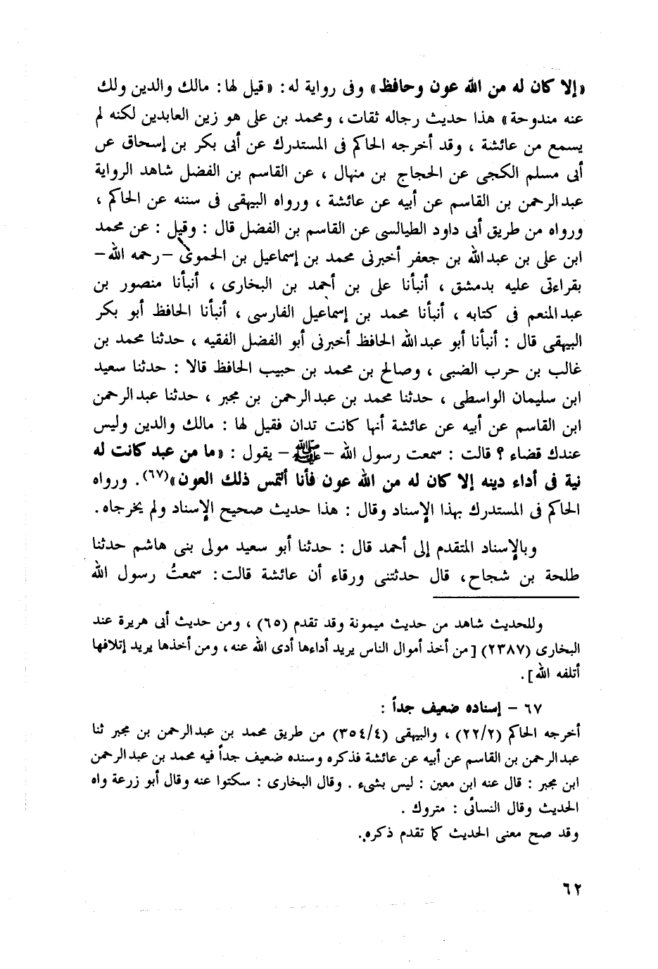 "إلا كان له من الله عون وحافظ" وفي رواية له: "قيل لها: مالك والدين ولك عنه مندوحة" هذا حديث رجاله ثقات، ومحمد بن علي هو زين العابدين لكنه لم يسمع من عائشة، وقد أخرجه الحاكم في المستدرك عن أبي بكر بن إسحاق عن أبي مسلم الكجي عن الحجاج بن منهال، عن القاسم بن الفضل شاهد الرواية عبد الرحمن بن القاسم عن أبيه عن عائشة، ورواه البيهقي في سننه عن الحاكم، ورواه من طريق أبي داود الطيالسي عن القاسم بن الفضل قال: وقيل: عن محمد ابن علي بن عبد الله بن جعفر أخبرني محمد بن إسماعيل بن الحموي -رحمه الله- بقراءتي عليه بدمشق، أنبأنا علي بن أحمد بن البخاري، أنبأنا منصور بن عبد المنعم في كتابه، أنبأنا محمد بن إسماعيل الفارسي، أنبأنا الحافظ أبو بكر البيهقي قال: أنبأنا أبو عبد الله الحافظ أخبرني أبو الفضل الفقيه، حدثنا محمد بن غالب بن حرب الضبي، وصالح بن محمد بن حبيب الحافظ قالا: حدثنا سعيد ابن سليمان الواسطي، حدثنا محمد بن عبد الرحمن بن مجبر، حدثنا عبد الرحمن ابن القاسم عن أبيه عن عائشة أنها كانت تدان فقيل لها: مالك والدين وليس عندك قضاء؟ قالت: سمعت رسول الله - صلى الله عليه وسلم - يقول: "ما من عبد كانت له نية في أداء دينه إلا كان له من الله عون فأنا ألتمس ذلك العون" (¬67). ورواه الحاكم في المستدرك بهذا الإِسناد وقال: هذا حديث صحيح الإِسناد ولم يخرجاه.