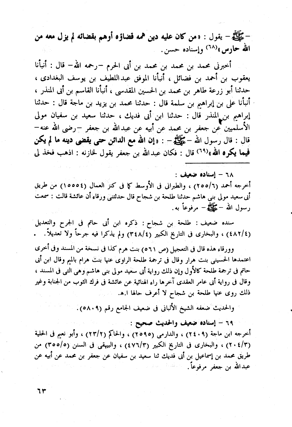 أخبرني محمد بن محمد بن محمد بن أبي الحرم -رحمه الله- قال: أنبأنا يعقوب بن أحمد بن فضائل، أنبأنا الموفق عبد اللطف بن يوسف البغدادي، حدثنا أبو زرعة طاهر بن محمد بن الحسين المقدسي، أنبأنا القاسم بن أبي المنذر، أنبأنا علي بن إبراهيم بن سلمة قال: حدثنا محمد بن يزيد بن ماجة قال: حدثنا إبراهيم بن المنذر قال: حدثنا ابن أبي فديك، حدثنا سعيد بن سفيان مولى الأسلميين عن جعفر بن محمد عن أبيه عن عبد الله بن جعفر -رضي الله عنه- قال: قال رسول الله - صلى الله عليه وسلم -: "إن الله مع الدائن حتى يقضى دينه ما لم يكن فيما يكره الله" (¬69) قال: فكان عبد الله بن جعفر يقول لخازنه: اذهب فخذ لي