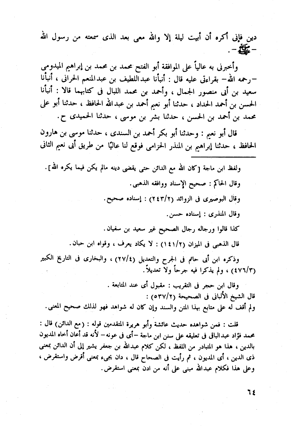 قلت: فمن شواهده حديث عاثشة وأبو هريرة المتقدمين قوله: (مع الدائن) قال: محمد فؤاد عبد الباقي في تعليقه على سنن ابن ماجة -أي في عونه- لأنه قد أعان أخاه المديون بالدين، هذا هو المتبادر من اللفظ، لكن كلام عبد الله بن جعفر يشير إلى أن الدائن بمعنى ذى الدين، أي المديون، ثم رأيت في الصحاح قال، دان يجيء بمعنى أقرض واستقرض، وعلى هذا فكلام عبد الله مبني على أنه من ادن بمعنى استقرض.