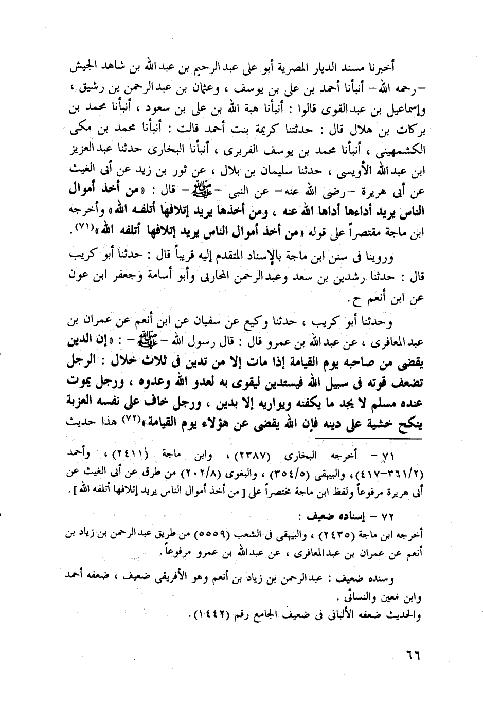 أخبرنا مسند الديار المصرية أبو علي عبد الرحيم بن عبد الله بن شاهد الجيش -رحمه الله- أنبأنا أحمد بن علي بن يوسف، وعثمان بن عبد الرحمن بن رشيق، وإسماعيل بن عبد القوي قالوا: أنبأنا هبة الله بن علي بن سعود، أنبأنا محمد بن بركات بن هلال قال: حدثتنا كريمة بنت أحمد قالت: أنبأنا محمد بن مكي الكشمهيني، أنبأنا محمد بن يوسف الفربري، أنبأنا البخاري حدثنا عبد العزيز ابن عبد الله الأويسي، حدثنا سليمان بن بلال، عن ثور بن زيد عن أبي الغيث عن أبي هريرة -رضي الله عنه- عن النبي - صلى الله عليه وسلم - قال: "من أخذ أموال الناس يريد أداءها أداها الله عنه، ومن أخذها يريد إتلافها أتلفه الله" وأخرجه ابن ماجة مقتصراً على قوله "من أخذ أموال الناس يريد إتلافها أتلفه الله" (¬71).