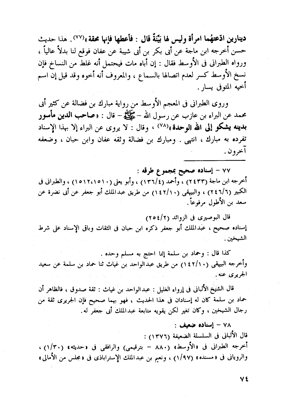 دينارين ادّعتهُما امرأة وليس لها بَيِّنَةٌ قال: فأعطها فإنها محقة" (¬77). هذا حديث حسن أخرجه ابن ماجة عن أبي بكر بن أبي شيبة عن عفان فوقع لنا بدلاً عالياً، ورواه الطبراني في الأوسط فقال: إن أباه مات فيحتمل أنه غلط من النساخ فإن نسخ الأوسط كسر لعدم اتصالها بالسماع، والمعروف أنه أخوه وقد قيل إن اسم أخيه المتوفي يسار.