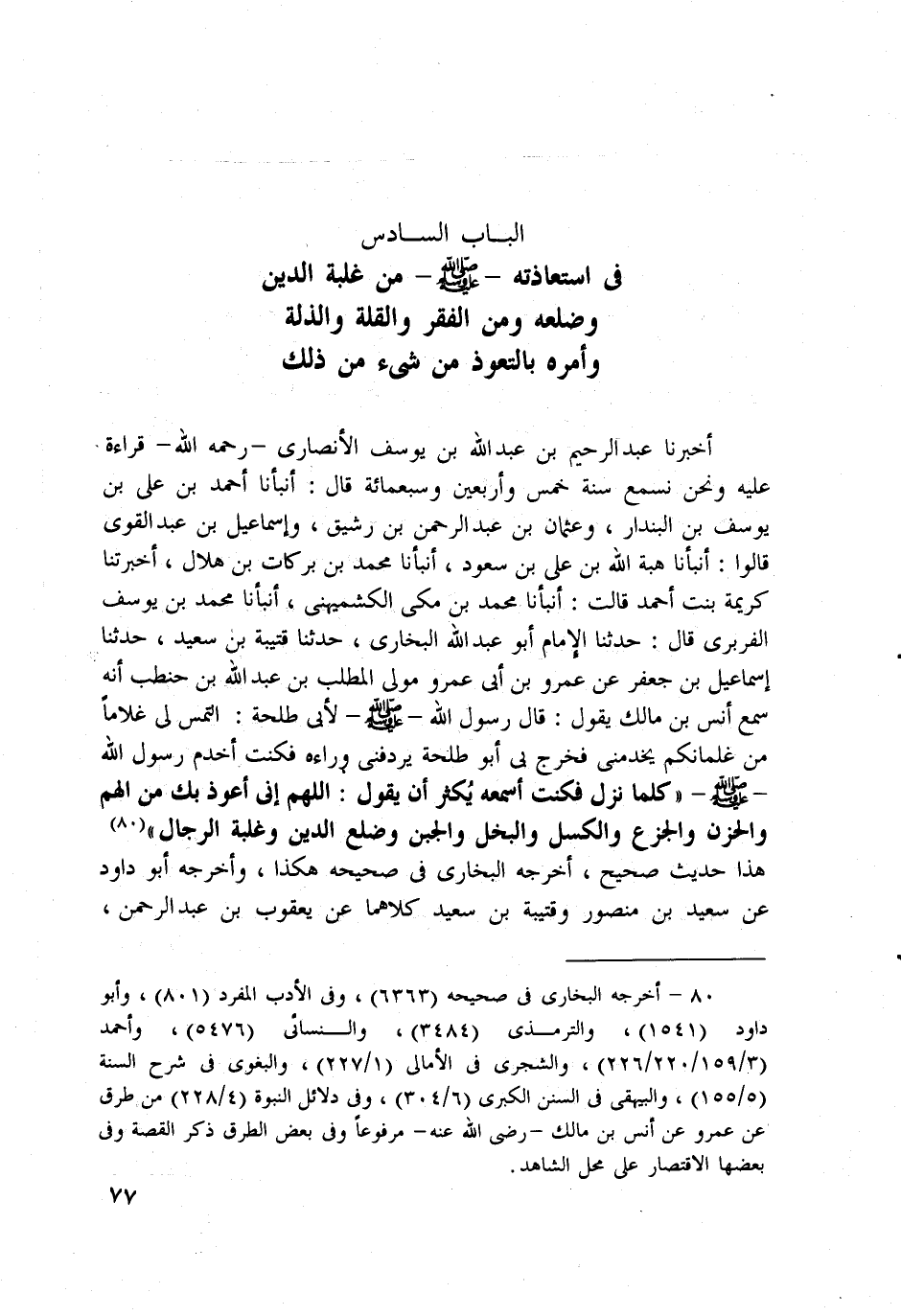 أخبرنا عبد الرحيم بن عبد الله بن يوسف الأنصاري -رحمه الله- قراءة عليه ونحن نسمع سنة خمس وأربعين وسبعمائة قال: أنبأنا أحمد بن علي بن يوسف بن البندار، وعثمان بن عبد الرحمن بن رشيق، وإسماعيل بن عبد القوي قالوا: أنبأنا هبة الله بن علي بن سعود، أنبأنا محمد بن بركات بن هلال، أخبرتنا كريمة بنت أحمد قالت: أنبأنا محمد بن مكي الكشميهني، أنبأنا محمد بن يوسف الفربري قال: حدثنا الإِمام أبو عبد الله البخاري، حدثنا قتيبة بن سعيد، حدثنا إسماعيل بن جعفر عن عمرو بن أبي عمرو مولى المطلب بن عبد الله بن حنطب أنه سمع أنس بن مالك يقول: قال رسول الله - صلى الله عليه وسلم - لأبي طلحة: التمس لي غلاماً من غلمانكم يخدمني فخرج بي أبو طلحة يردفني وراءه فكنت أخدم رسول الله - صلى الله عليه وسلم - "كلما نزل فكنت أسمعه يُكثر أن يقول: اللهم إني أعوذ بك من الهم والحزن والجزع والكسل والبخل والجبن وضلع الدين وغلبة الرجال" (¬80).