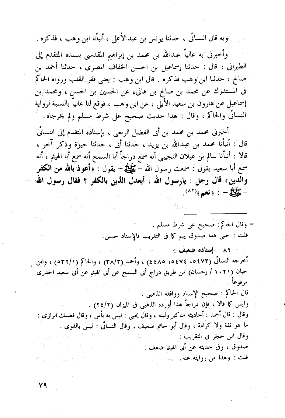 أخبرني محمد بن محمد بن أبي الفضل الربعي، بإسناده المتقدم إلى النسائي قال: أنبأنا محمد بن عبد الله بن يزيد، حدثنا أبي، حدثنا حيوة وذكر آخر، قالا: أنبأنا سالم بن غيلان التجيبي أنه سمع دراجاً أبا السمح أنه سمع أبا الهيثم، أنه سمع أبا سعيد يقول: سمعت رسول الله - صلى الله عليه وسلم - يقول: "أعوذ بالله من الكفر والدين" قال رجل: يا رسول الله، أيعدل الدَّين بالكفر؟ فقال رسول الله - صلى الله عليه وسلم -: "نعم" (¬82).
