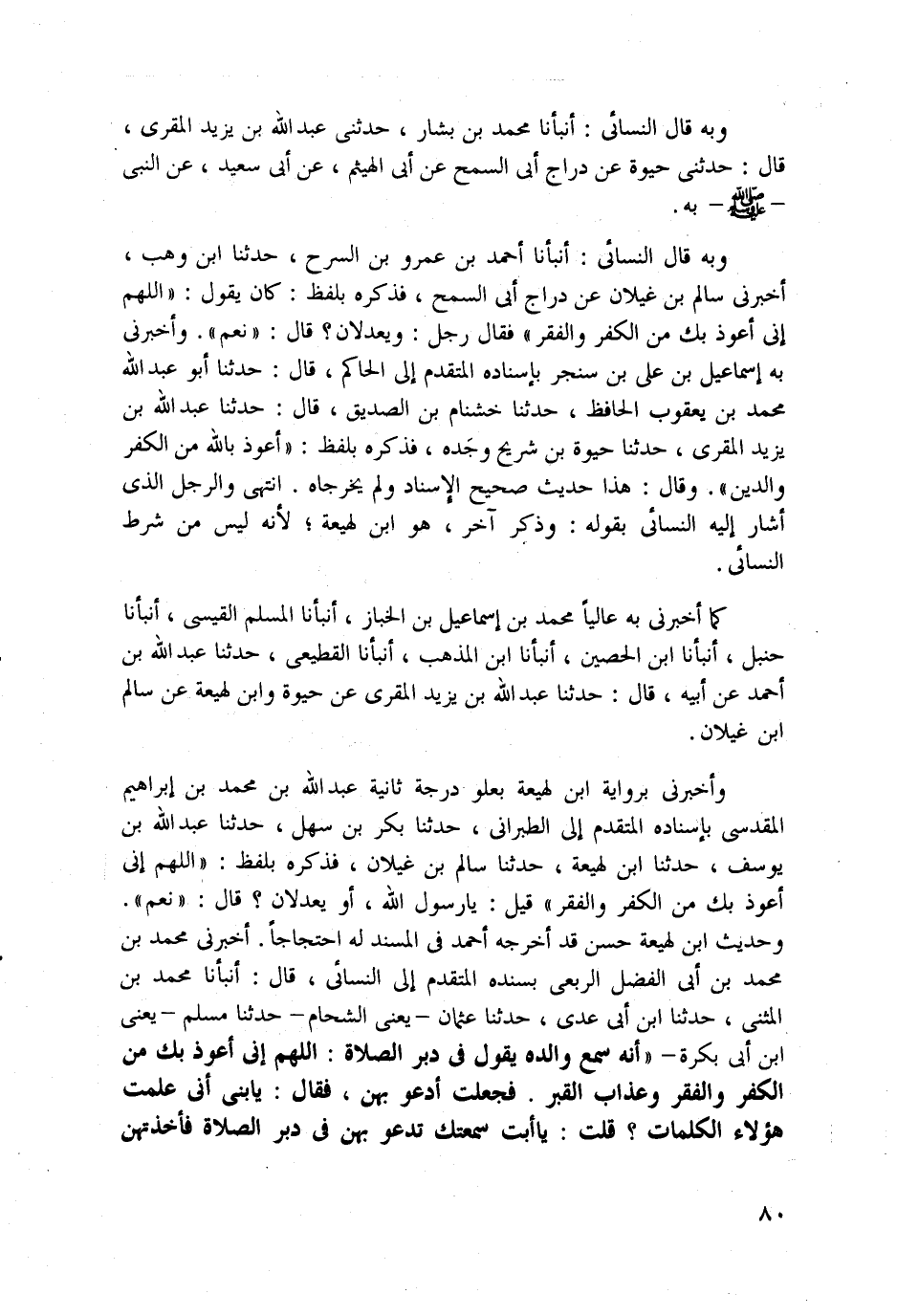 وأخبرني برواية ابن لهيعة بعلو درجة ثانية عبد الله بن محمد بن إبراهيم المقدسي بإسناده المتقدم إلى الطبراني، حدثنا بكر بن سهل، حدثنا عبد الله بن يوسف، حدثنا ابن لهيعة، حدثنا سالم بن غيلان، فذكره بلفظ: "اللهم إني أعوذ بك من الكفر والفقر" قيل: يا رسول الله، أو يعدلان؟ قال: "نعم". وحديث ابن لهيعة حسن قد أخرجه أحمد في المسند له احتجاجاً. أخبرني محمد بن محمد بن أبي الفضل الربعي بسنده المتقدم إلى النسائي، قال: أنبأنا محمد بن المثنى، حدثنا ابن أبي عدي، حدثنا عثمان -يعني الشحام- حدثنا مسلم -يعني ابن أبي بكرة- "أنه سمع والده يقول في دبر الصلاة: اللهم إني أعوذ بك من الكفر والفقر وعذاب القبر. فجعلت أدعو بهن، فقال: يا بني أني علمت هؤلاء الكلمات؟ قلت: يا أبت سمعتك تدعو بهن في دبر الصلاة فأخذتهن