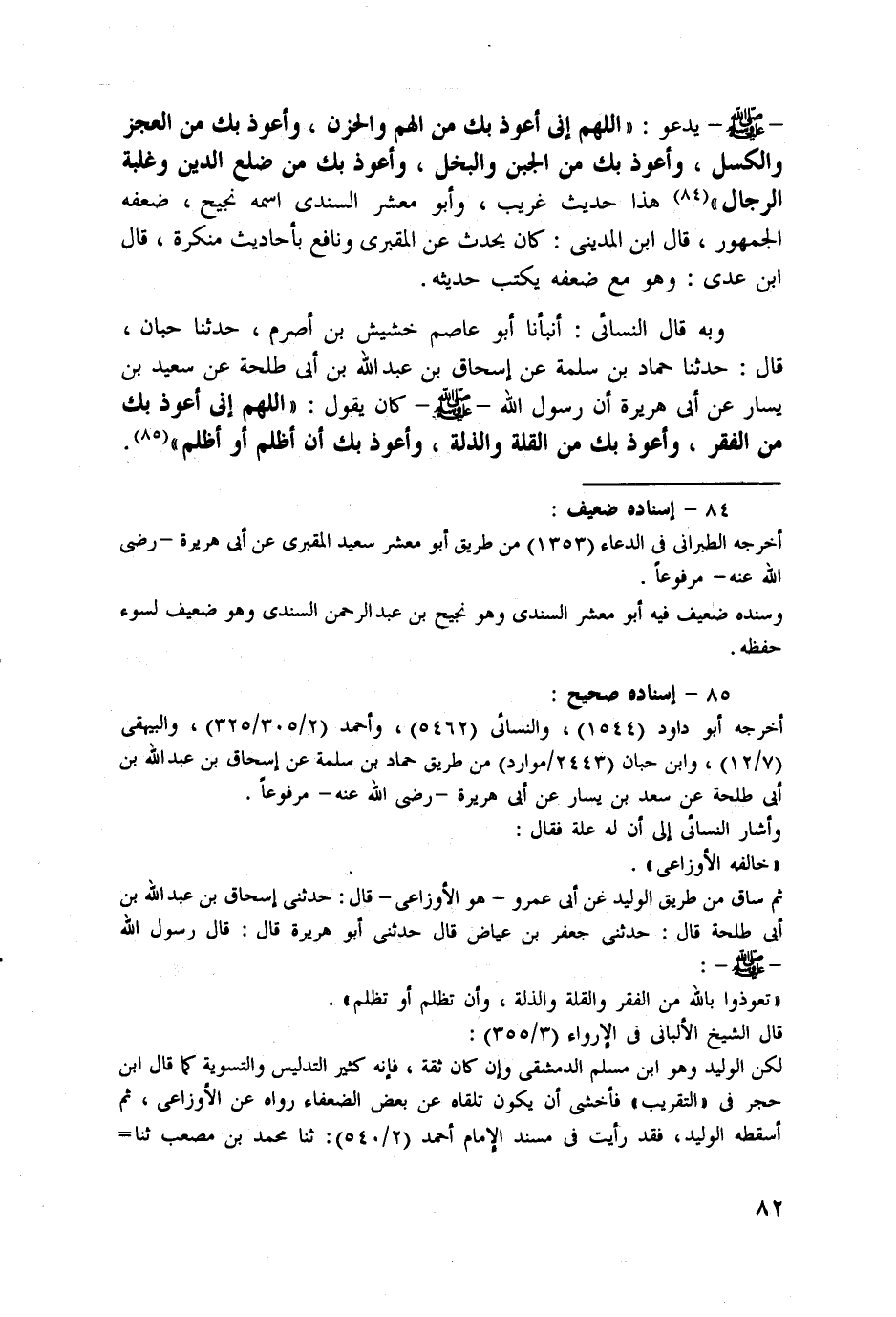 وبه قال النسائي: أنبأنا أبو عاصم خشيش بن أصرم، حدثنا حبان، قال: حدثنا حماد بن سلمة عن إسحاق بن عبد الله بن أبي طلحة عن سعيد بن يسار عن أبي هريرة أن رسول الله - صلى الله عليه وسلم - كان يقول: "اللهم إني أعوذ بك من الفقر، وأعوذ بك من القلة والذلة، وأعوذ بك أن أظلم أو أظلم" (¬85).