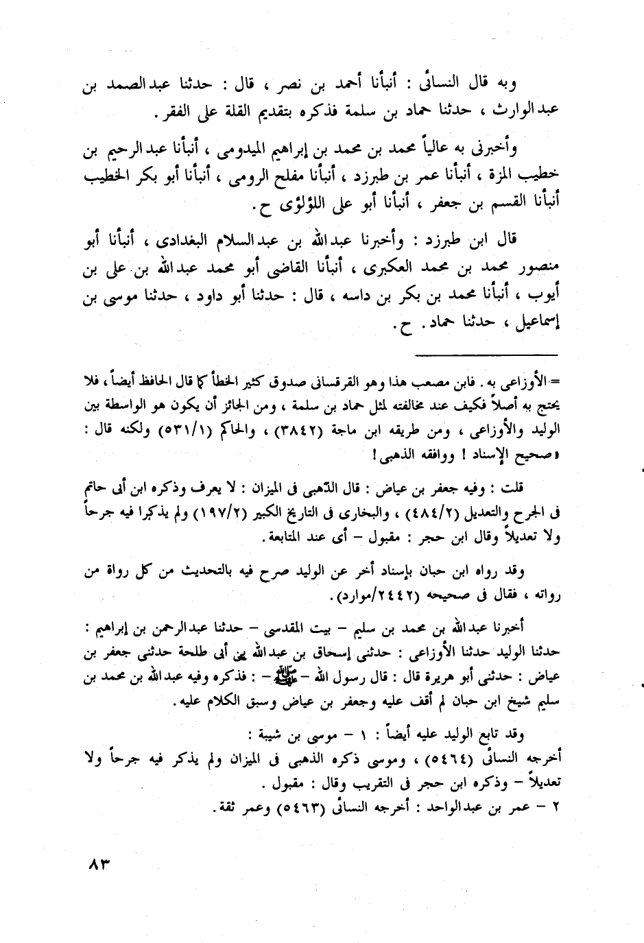 = الأوزاعي به. فابن مصعب هذا وهو القرقساني صدوق كثير الخطأ كما قال الحافظ أيضاً، فلا يحتج به أصلاً فكيف عند مخالفته لمثل حماد بن سلمة، ومن الجائز أن يكون هو الواسطة بين الوليد والأوزاعي، ومن طريقه ابن ماجة (3842)، والحاكم (1/ 531) ولكنه قال: