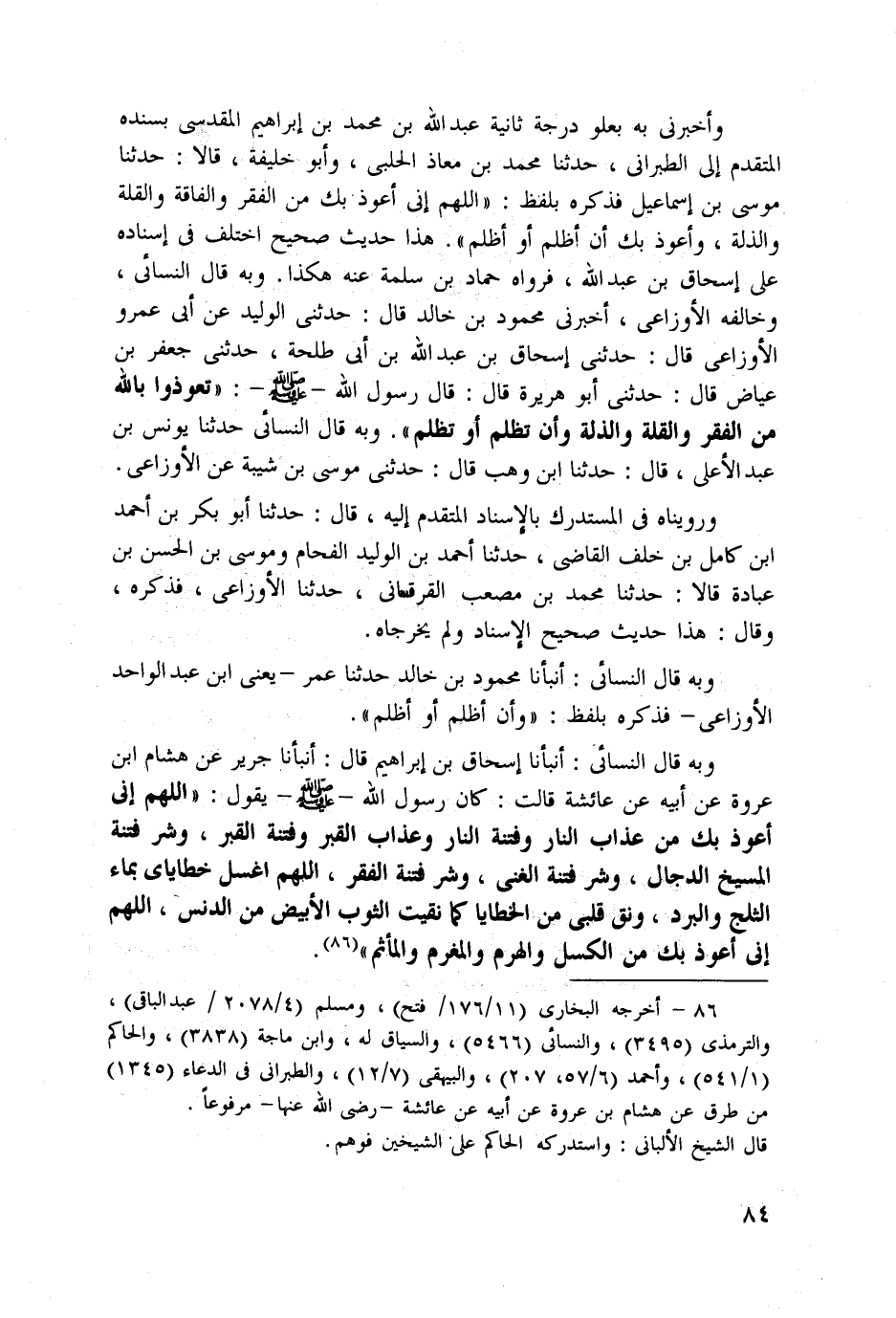وأخبرني به بعلو درجة ثانية عبد الله بن محمد بن إبراهيم المقدسي بسنده المتقدم إلى الطبراني، حدثنا محمد بن معاذ الحلبي، وأبو خليفة، قالا: حدثنا موسى بن إسماعيل فذكره بلفظ: "اللهم إني أعوذ بك من الفقر والفاقة والقلة والذلة، وأعوذ بك أن أظلم أو أظلم". هذا حديث صحيح اختلف في إسناده على إسحاق بن عبد الله، فرواه حماد بن سلمة عنه هكذا. وبه قال النسائي، وخالفه الأوزاعي، أخبرني محمود بن خالد قال: حدثني الوليد عن أبي عمرو الأوزاعي قال: حدثني إسحاق بن عبد الله بن أبي طلحة، حدثني جعفر بن عياض قال: حدثني أبو هريرة قال: قال رسول الله - صلى الله عليه وسلم -: "تعوذوا بالله من الفقر والقلة والذلة وأن تظلم أو تظلم". وبه قال النسائي حدثنا يونس بن عبد الأعلى، قال: حدثنا ابن وهب قال: حدثني موسى بن شيبة عن الأوزاعي.