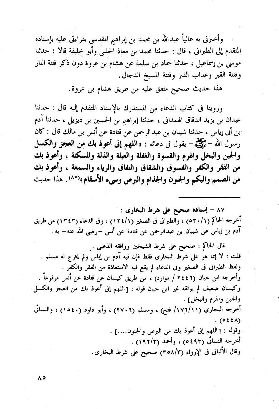 وروينا في كتاب الدعاء من المستدرك بالإِسناد المتقدم إليه قال: حدثنا عبدان بن يزيد الدقاق الهمداني، حدثنا إبراهيم بن الحسين بن ديزيل، حدثنا آدم بن أبي إياس، حدثنا شيبان بن عبد الرحمن عن قتادة عن أنس بن مالك قال: كان رسول الله - صلى الله عليه وسلم - يقول في دعائه: اللهم إني أعوذ بك من العجز والكسل والجبن والبخل والهرم والقسوة والغفلة والعيلة والذلة والمسكنة، وأعوذ بك من الفقر والكفر والفسوق والشقاق والنفاق والرياء والسمعة، وأعوذ بك من الصمم والبكم والجنون والجذام والبرص وسيء الأسقام" (¬87). هذا حديث