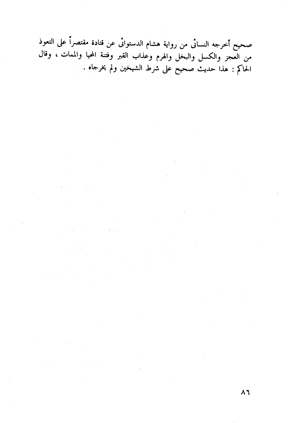 صحيح أخرجه النسائي من رواية هشام الدستوائي عن قتادة مقتصراً على التعوذ من العجز والكسل والبخل والهرم وعذاب القبر وفتنة المحيا والممات، وقال الحاكم: هذا حديث صحيح على شرط الشيخين ولم يخرجاه.