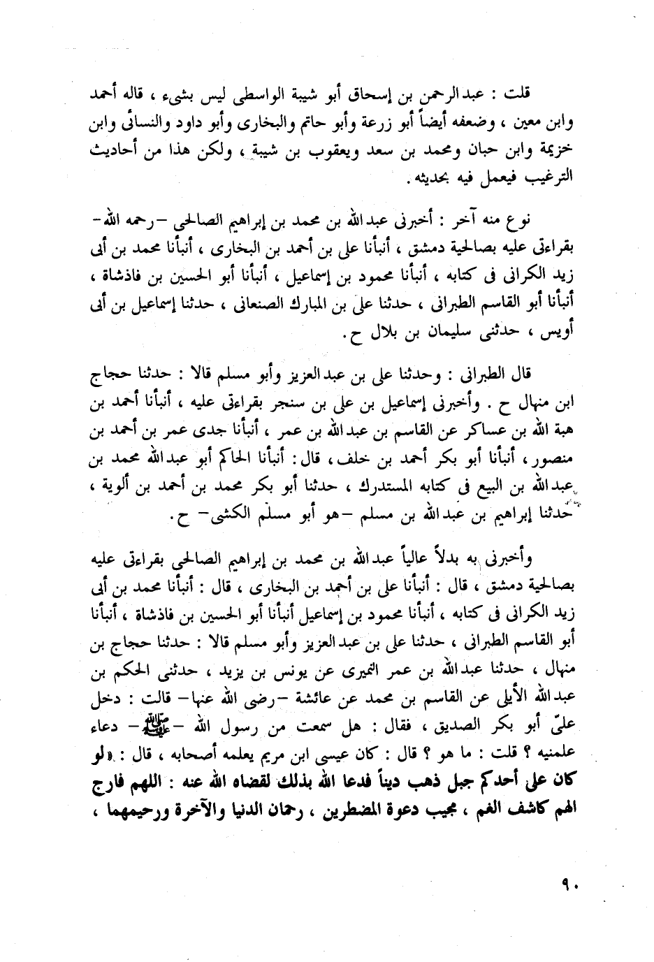 وأخبرني به بدلاً عالياً عبد الله بن محمد بن إبراهيم الصالحي بقراءتي عليه بصالحية دمشق، قال: أنبأنا علي بن أحمد بن البخاري، قال: أنبأنا محمد بن أبي زيد الكراني في كتابه، أنبأنا محمود بن إسماعيل أنبأنا أبو الحسين بن فاذشاة، أنبأنا أبو القاسم الطبراني، حدثنا علي بن عبد العزيز وأبو مسلم قالا: حدثنا حجاج بن منهال، حدثنا عبد الله بن عمر النميري عن يونس بن يزيد، حدثني الحكم بن عبد الله الأيلي عن القاسم بن محمد عن عائشة -رضي الله عنها- قالت: دخل عليّ أبو بكر الصديق، فقال: هل سمعت من رسول الله - صلى الله عليه وسلم - دعاء علمنيه؟ قلت: ما هو؟ قال: كان عيسى ابن مريم يعلمه أصحابه، قال: "لو كان على أحدكم جبل ذهب ديناً فدعا الله بذلك لقضاه الله عنه: اللهم فارج الهم كاشف الغم، مجيب دعوة المضطرين، رحمان الدنيا والآخرة ورحيمهما،