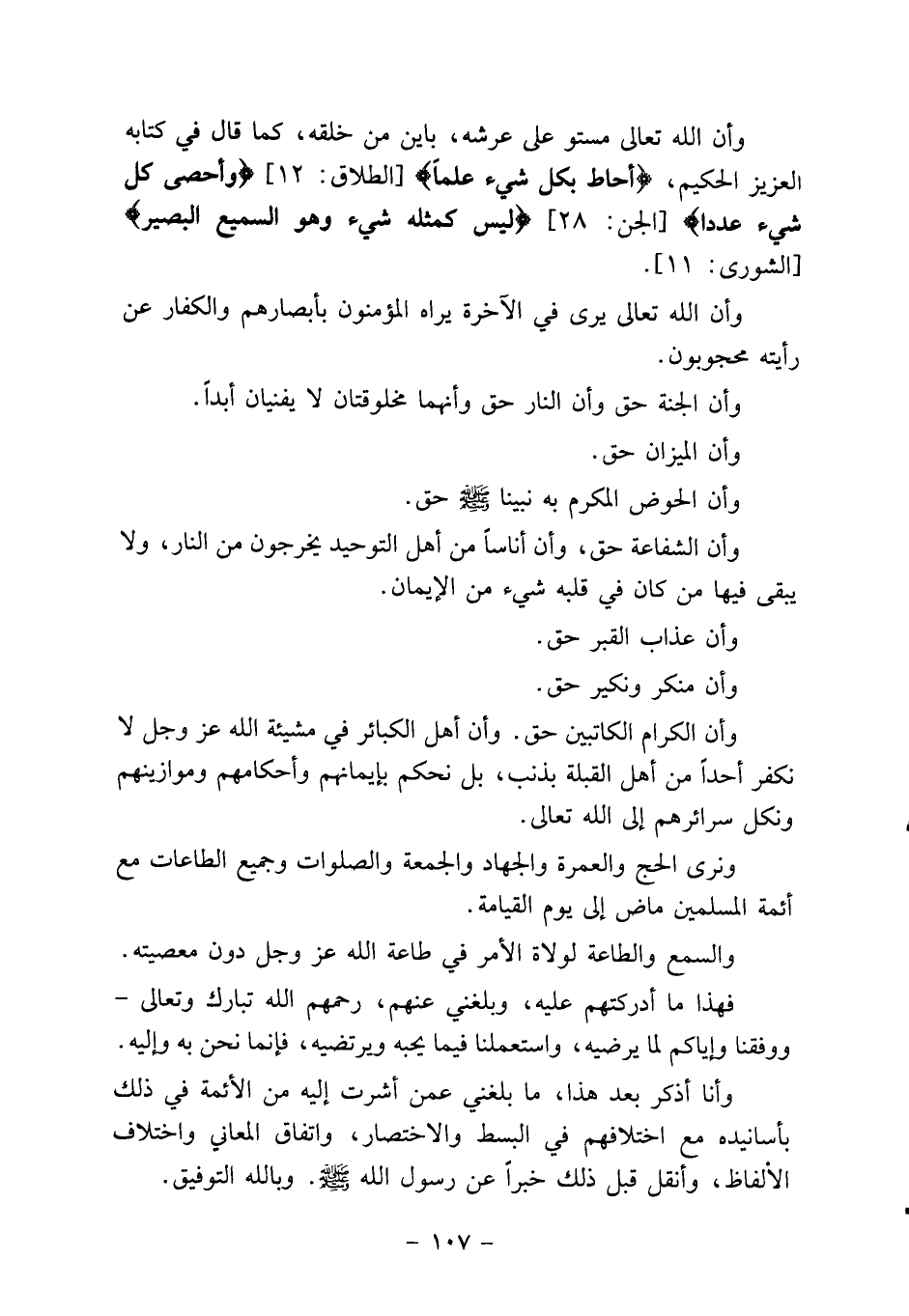 وأن الله تعالى مستو على عرشه، باين من خلقه، كما قال في كتابه العزيز الحكيم، {أحاط بكل شيء علما} [الطلاق: 12] {وأحصى كل شيء عددا} [الجن: 28] {ليس كمثله شيء وهو السميع البصير} [الشورى: 11] .