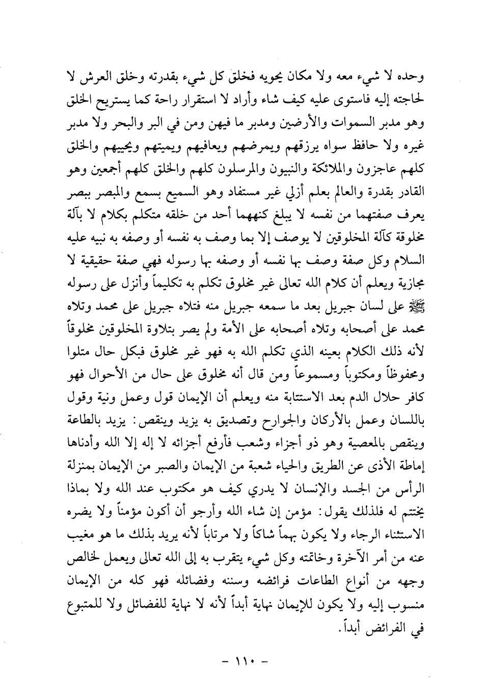 وحده لا شيء معه ولا مكان يحويه فخلق كل شيء بقدرته وخلق العرش لا لحاجته إليه فاستوى عليه كيف شاء وأراد لا استقرار راحة كما يستريح الخلق وهو مدبر السموات والأرضين ومدبر ما فيهن ومن في البر والبحر ولا مدبر غيره ولا حافظ سواه يرزقهم ويمرضهم ويعافيهم ويميتهم ويحييهم والخلق كلهم عاجزون والملائكة والنبيون والمرسلون كلهم والخلق كلهم أجمعين وهو القادر بقدرة والعالم بعلم أزلي غير مستفاد وهو السميع بسمع والمبصر ببصر يعرف صفتهما من نفسه لا يبلغ كنههما أحد من خلقه متكلم بكلام لا بآلة مخلوقة كآلة المخلوقين لا يوصف إلا بما وصف به نفسه أو وصفه به نبيه عليه السلام وكل صفة وصف بها نفسه أو وصفه بها رسوله فهي صفة حقيقية لا مجازية ويعلم أن كلام الله تعالى غير مخلوق تكلم به تكليماً وأنزل على رسوله صلى الله عليه وسلم على لسان جبريل بعد ما سمعه جبريل منه فتلاه جبريل على محمد وتلاه محمد على أصحابه وتلاه أصحابه على الأمة ولم يصر بتلاوة المخلوقين مخلوقاً لأنه ذلك الكلام بعينه الذي تكلم الله به فهو غير مخلوق فبكل حال متلواً ومحفوظاً ومكتوباً ومسموعاً ومن قال أنه مخلوق على حال من الأحوال فهو كافر حلال الدم بعد الاستتابة منه ويعلم أن الإيمان قول وعمل ونية وقول باللسان وعمل بالأركان والجوارح وتصديق به يزيد وينقص: يزيد بالطاعة وينقص بالمعصية وهو ذو أجزاء وشعب فأرفع أجزائه لا إله إلا الله وأدناها إماطة الأذى عن الطريق والحياء شعبة من الإيمان والصبر من الإيمان بمنزلة الرأس من الجسد والإنسان لا يدري كيف هو مكتوب عند الله ولا بماذا يختتم له فلذلك يقول: مؤمن إن شاء الله وأرجو أن أكون مؤمناً ولا يضره الاستثناء الرجاء ولا يكون بهما شاكاً ولا مرتاباً لأنه يريد بذلك ما هو مغيب عنه من أمر الآخرة وخاتمته وكل شيء يتقرب به إلى الله تعالى ويعمل لخالص وجهه من أنواع الطاعات فرائضه وسننه وفضائله فهو كله من الإيمان منسوب إليه ولا يكون للإيمان نهاية أبداً لأنه لا نهاية للفضائل ولا للمتبوع في الفرائض أبداً.