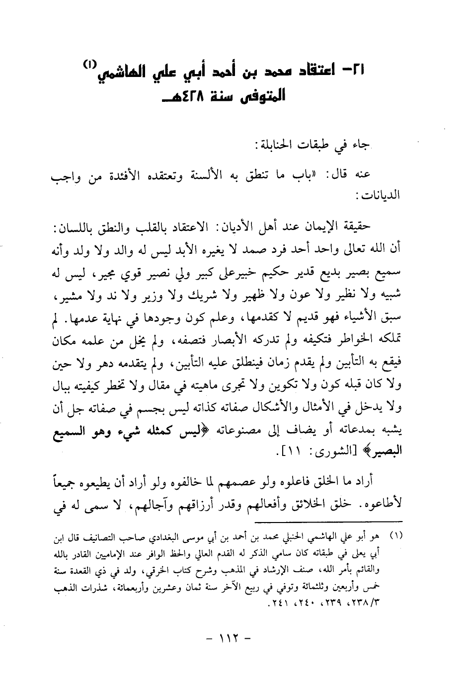 21- اعتقاد محمد بن أحمد أبي علي الهاشمي1 المتوفى سنة 8 م 2 هـ