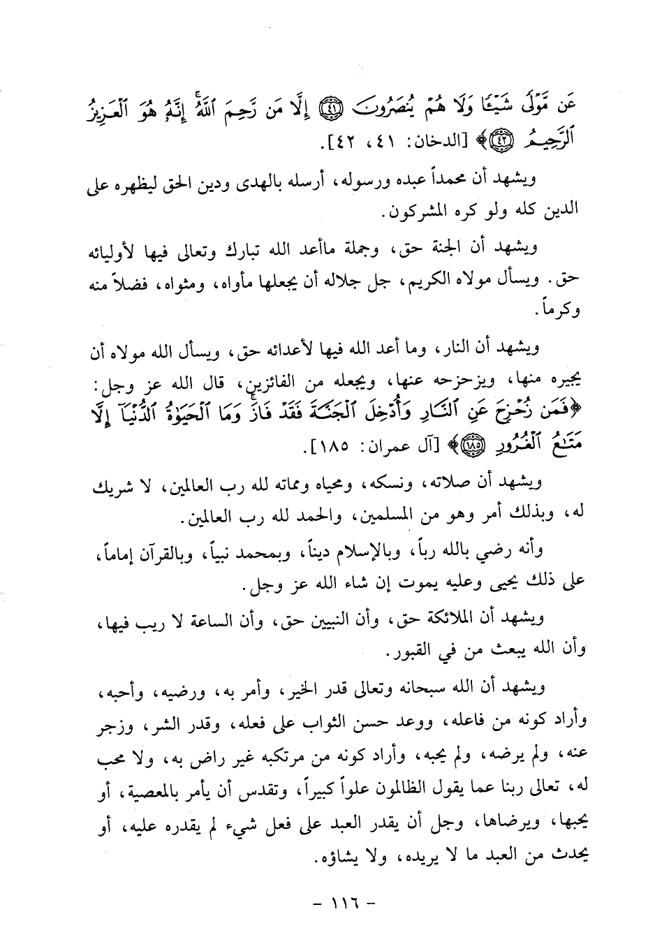 ويشهد أن النار، وما أعد الله فيها لأعدائه حق، ويسأل الله مولاه أن يجيره منها، ويزحزحه عنها، ويجعله من الفائزين، قال الله عز وجل: {فَمَنْ زُحْزِحَ عَنِ النَّارِ وَأُدْخِلَ الْجَنَّةَ فَقَدْ فَازَ وَمَا الْحَيَاةُ الدُّنْيَا إِلا مَتَاعُ الْغُرُورِ} [آل عمران: 185] .