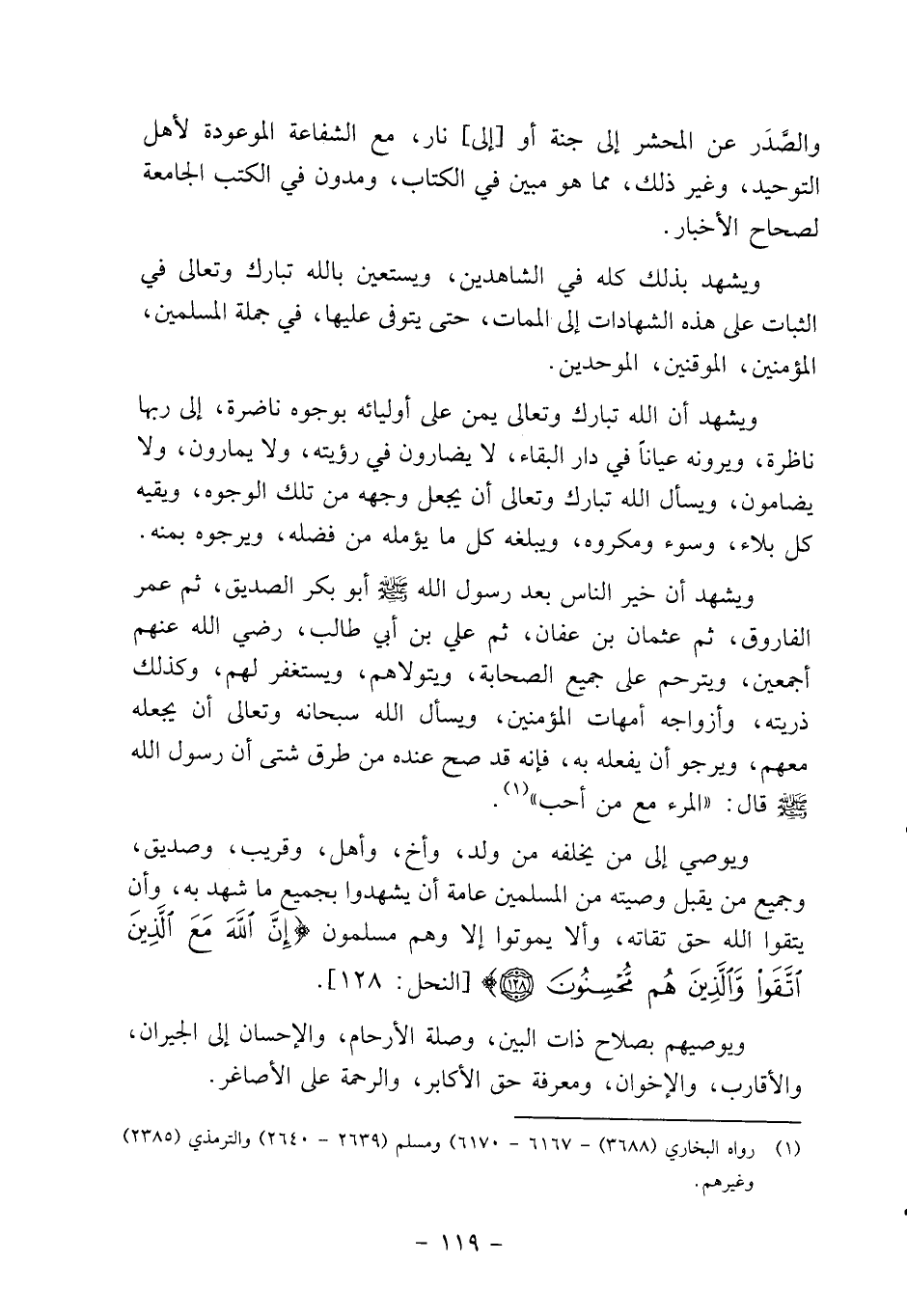 ويوصي إلى من يخلفه من ولد، وأخ، وأهل، وقريب، وصديق، وجميع من يقبل وصيته من المسلمين عامة أن يشهدوا بجميع ما شهد به، وأن يتقوا الله حق تقاته، وألا يموتوا إلا وهم مسلمون {إِنَّ اللَّهَ مَعَ الَّذِينَ اتَّقَوْا وَالَّذِينَ هُمْ مُحْسِنُونَ} [النحل: 128] .