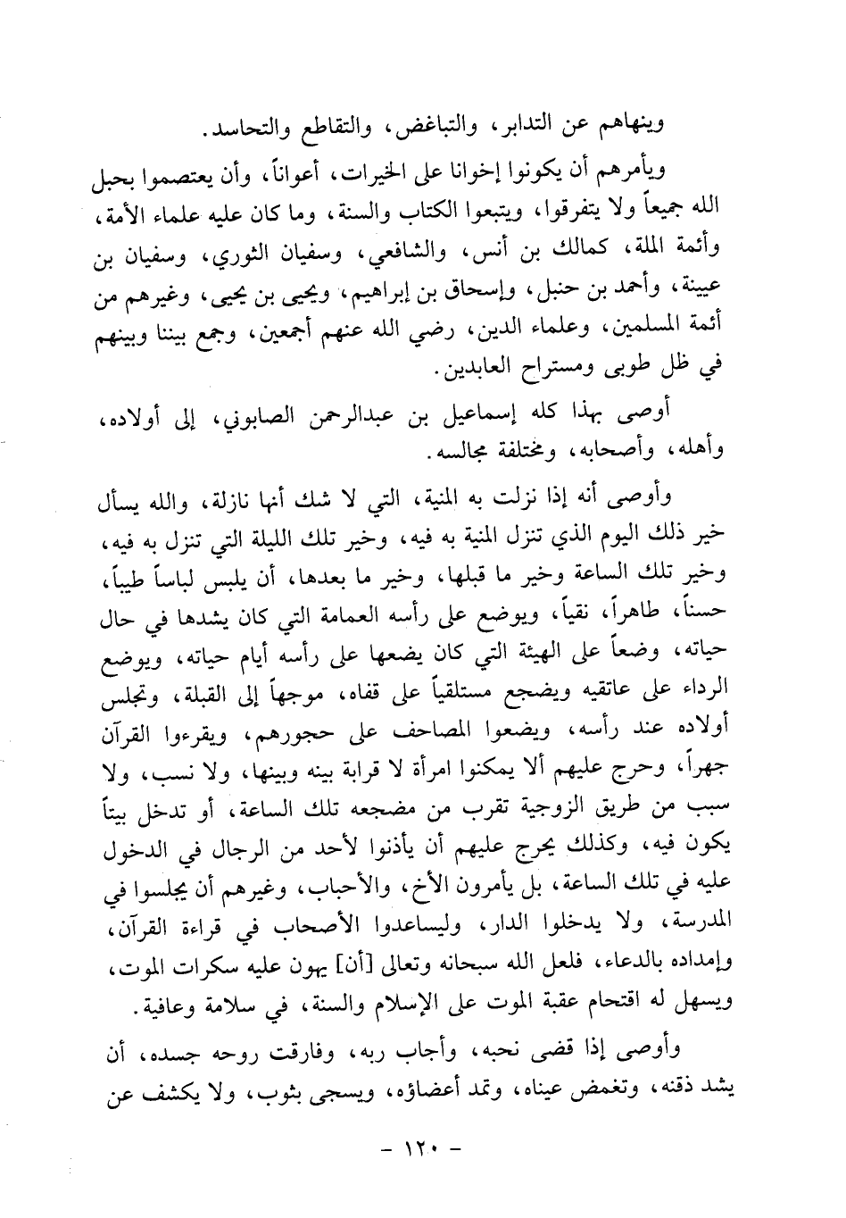 ويأمرهم أن يكونوا إخواناً على الخيرات، أعواناً، وأن يعتصموا بحبل الله جميعاً ولا يتفرقوا، ويتبعوا الكتاب والسنة، وما كان عليه علماء الأمة، وأئمة الملة، كمالك بن أنس، والشافعي، وسفيان الثوري، وسفيان بن عيينة، وأحمد بن حنبل، وإسحاق بن إبراهيم، ويحيى بن يحيى، وغيرهم من أئمة المسلمين، وعلماء الدين، رضي الله عنهم أجمعين، وجمع بيننا وبينهم في ظل طوبى ومستراح العابدين.