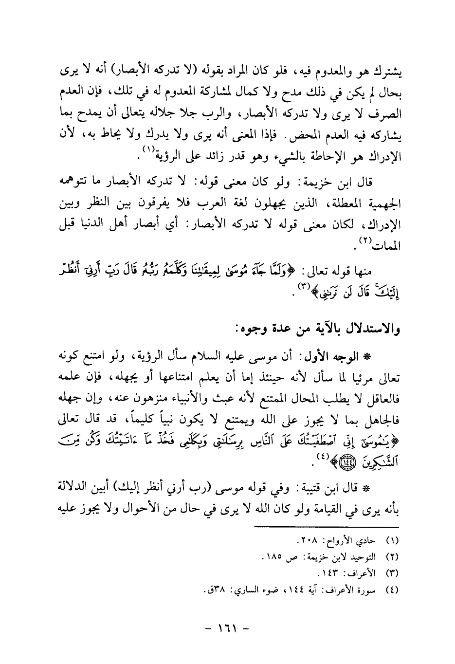 * الوجه الأول: أن موسى عليه السلام سأل الرؤية، ولو امتنع كونه تعالى مرئياً لما سأل لأنه حينئذ إما أن يعلم امتناعها أو يجهله، فإن علمه فالعاقل لا يطلب المحال الممتنع لأنه عبث والأنبياء منزهون عنه، وإن جهله فالجاهل بما لا يجوز على الله ويمتنع لا يكون نبياً كليماً، قد قال تعالى {قَالَ يَا مُوسَى إِنِّي اصْطَفَيْتُكَ عَلَى النَّاسِ بِرِسَالاتِي وَبِكَلامِي فَخُذْ مَا آتَيْتُكَ وَكُنْ مِنَ الشَّاكِرِينَ} 4.