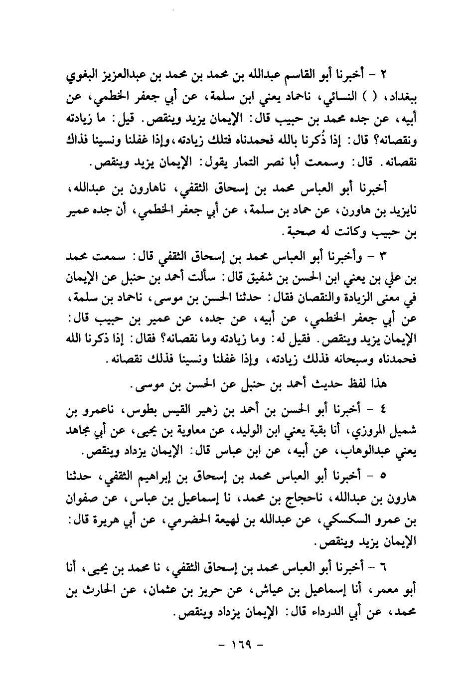 2- أخبرنا أبو القاسم عبد الله بن محمد بن محمد بن عبد العزبز البغوي ببغداد، () النسائي، نا حماد يعني ابن سلمة، عن أبي جعفر الخطمي، عن أبيه، عن جده محمد بن حبيب قال: الإيمان يزيد وينقص. قيل: ما زيادته ونقصانه؟ قال: إذا ذكرنا بالله فحمدناه فتلك زيادته، وإذا غفلنا ونسينا فذاك نقصانه. قال: وسمعت أبا نصر التمار يقول: الإيمان يزيد وينقص.