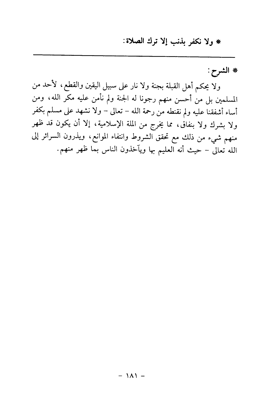 ولا يحكم أهل القبلة بجنة ولا نار على سبيل اليقين والقطع، لأحد من المسلمين بل من أحسن منهم رجونا له الجنة ولم نأمن عليه مكر الله، ومن أساء أشفقنا عليه ولم نقنطه من رحمة الله- تعالى- ولا نشهد على مسلم بكفر ولا بشرك ولا بنفاق، مما يخرج من الملة الإسلامية، إلا أن يكون قد ظهر منهم شيء من ذلك مع تحقق الشروط وانتفاء الموانع، ويذرون السرائر إلى الله تعالى- حيث أنه العليم بها ويآخذون الناس بما ظهر منهم.