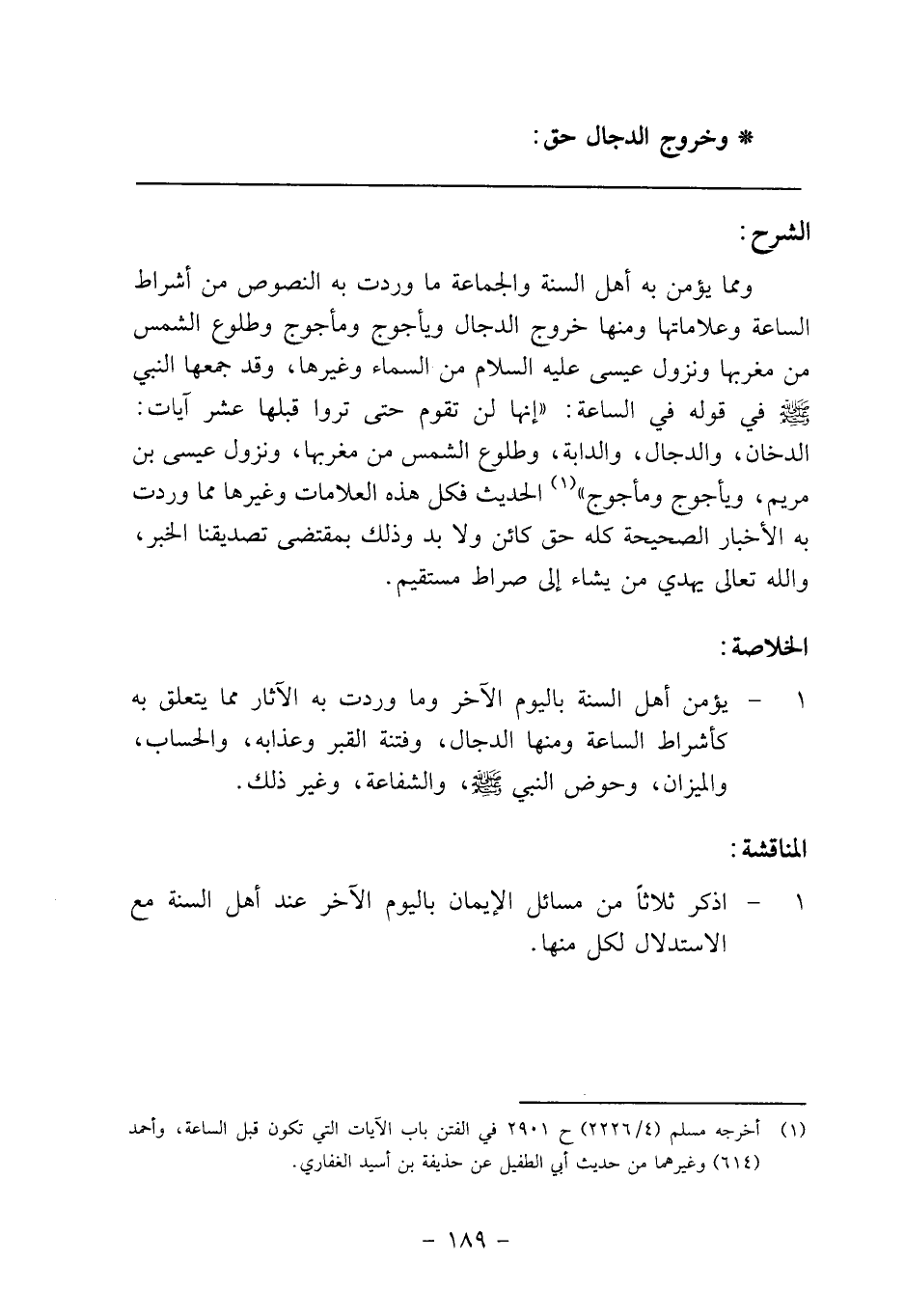 ومما يؤمن به أهل السنة والجماعة ما وردت به النصوص من أشراط الساعة وعلاماتها ومنها خروج الدجال ويأجوج ومأجوج وطلوع الشمس من مغربها ونزول عيسى عليه السلام من السماء وغيرها، وقد جمعها النبي صلى الله عليه وسلم في قوله في الساعة: "إنها لن تقوم حتى تروا قبلها عشر آيات: الدخان، والدجال، والدابة، وطلوع الشمس من مغربها، ونزول عيسى بن مريم، ويأجوج ومأجوج" 1 الحديث فكل هذه العلامات وغيرها مما وردت به الأخبار الصحيحة كله حق كائن ولا بد وذلك بمقتضى تصديقنا الخبر، والله تعالى يهدي من يشاء إلى صراط مستقيم.