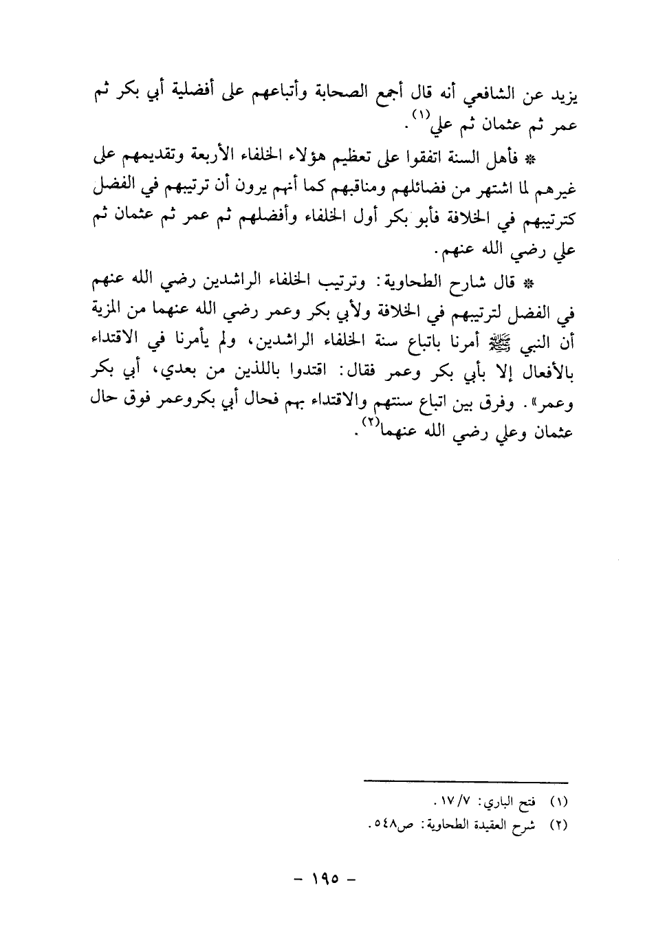 قال شارح الطحاوية: وترتيب الخلفاء الراشدين رضي الله عنهم في الفضل لترتيبهم في الخلافة ولأبي بكر وعمر رضي الله عنهما من المزية أن النبي صلى الله عليه وسلم أمرنا بإتباع سنة الخلفاء الراشدين، ولم يأمرنا في الإقتداء بالأفعال إلا بأبي بكر وعمر فقال: اقتدوا باللذين من بعدي، أبي بكر وعمر". وفرق بين اتباع سنتهم والإقتداء بهم فحال أبي بكر وعمر فوق حال عثمان وعلي رضي الله عنهما2.