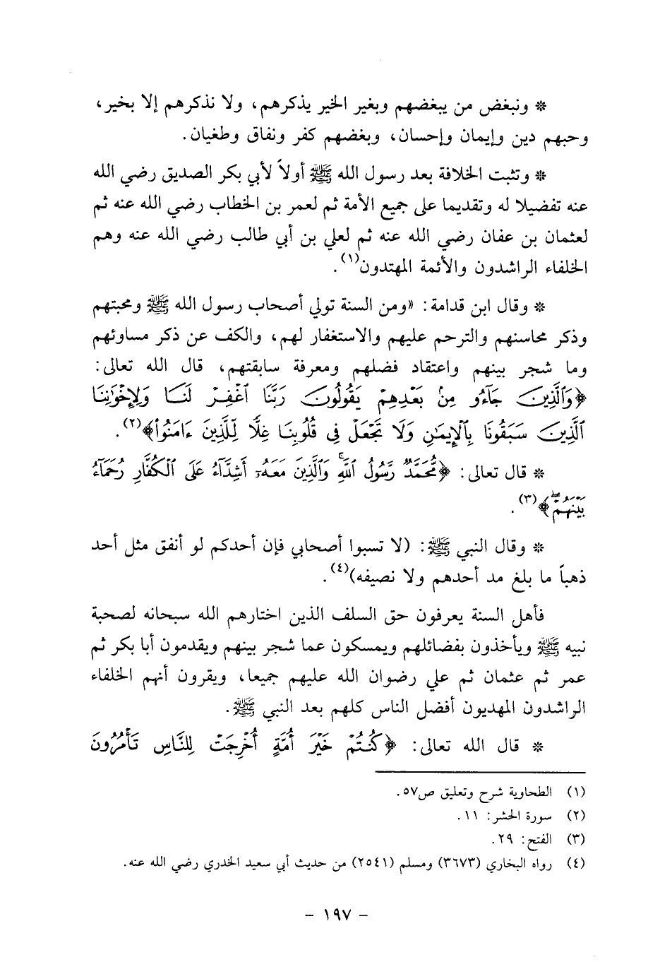 وقال ابن قدامة: "ومن السنة تولي أصحاب رسول الله صلى الله عليه وسلم ومحبتهم وذكر محاسنهم والترحم عليهم والاستغفار لهم، والكف عن ذكر مساوئهم وما شجر بينهم واعتقاد فضلهم ومعرفة سابقتهم، قال الله تعالى: {وَالَّذِينَ جَاءُوا مِنْ بَعْدِهِمْ يَقُولُونَ رَبَّنَا اغْفِرْ لَنَا وَلإِخْوَانِنَا الَّذِينَ سَبَقُونَا بِالأِيمَانِ وَلا تَجْعَلْ فِي قُلُوبِنَا غِلاً لِلَّذِينَ آمَنُوا} 2.