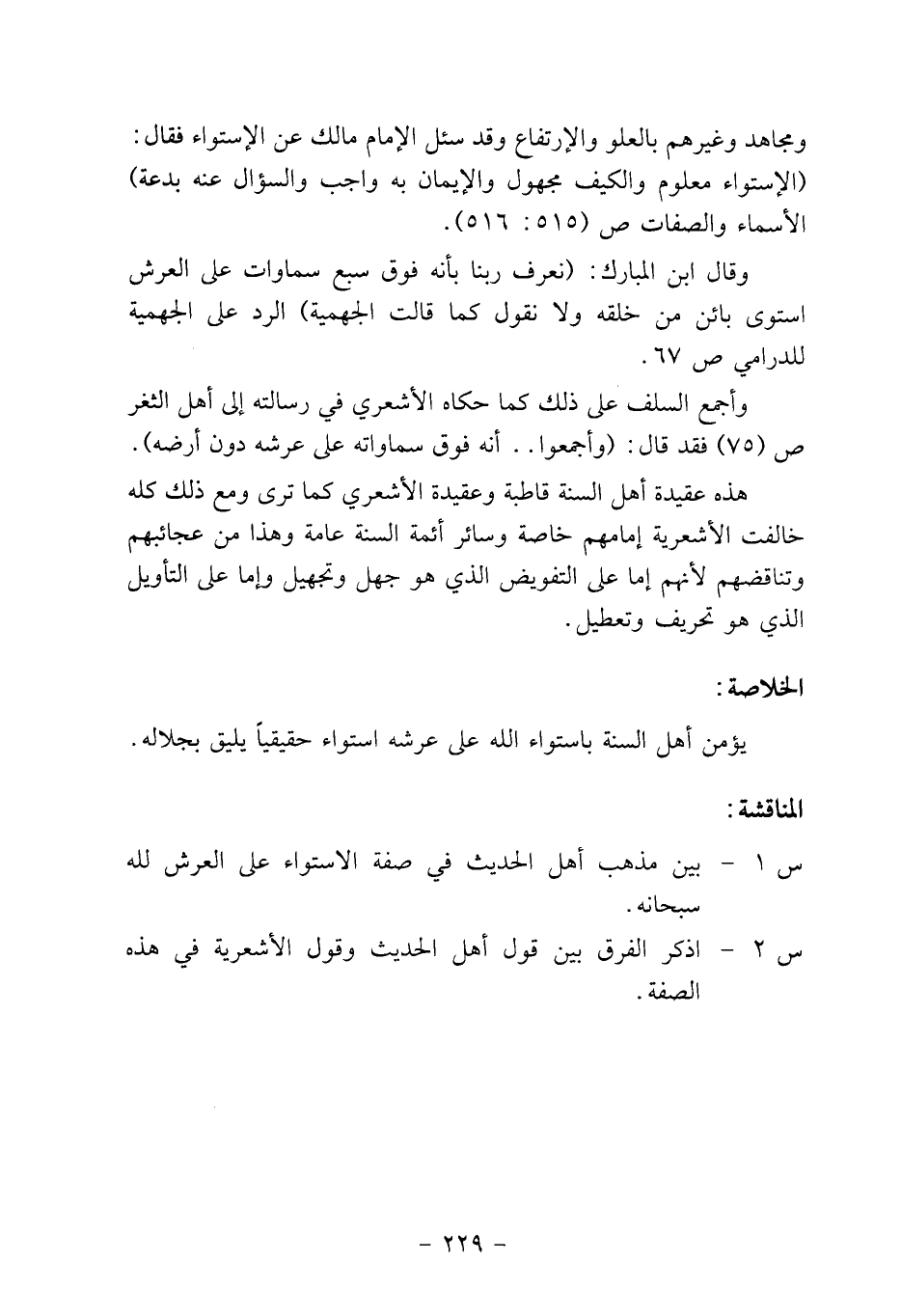 س 1- بين مذهب أهل الحديث في صفة الاستواء على العرش لله سبحانه.