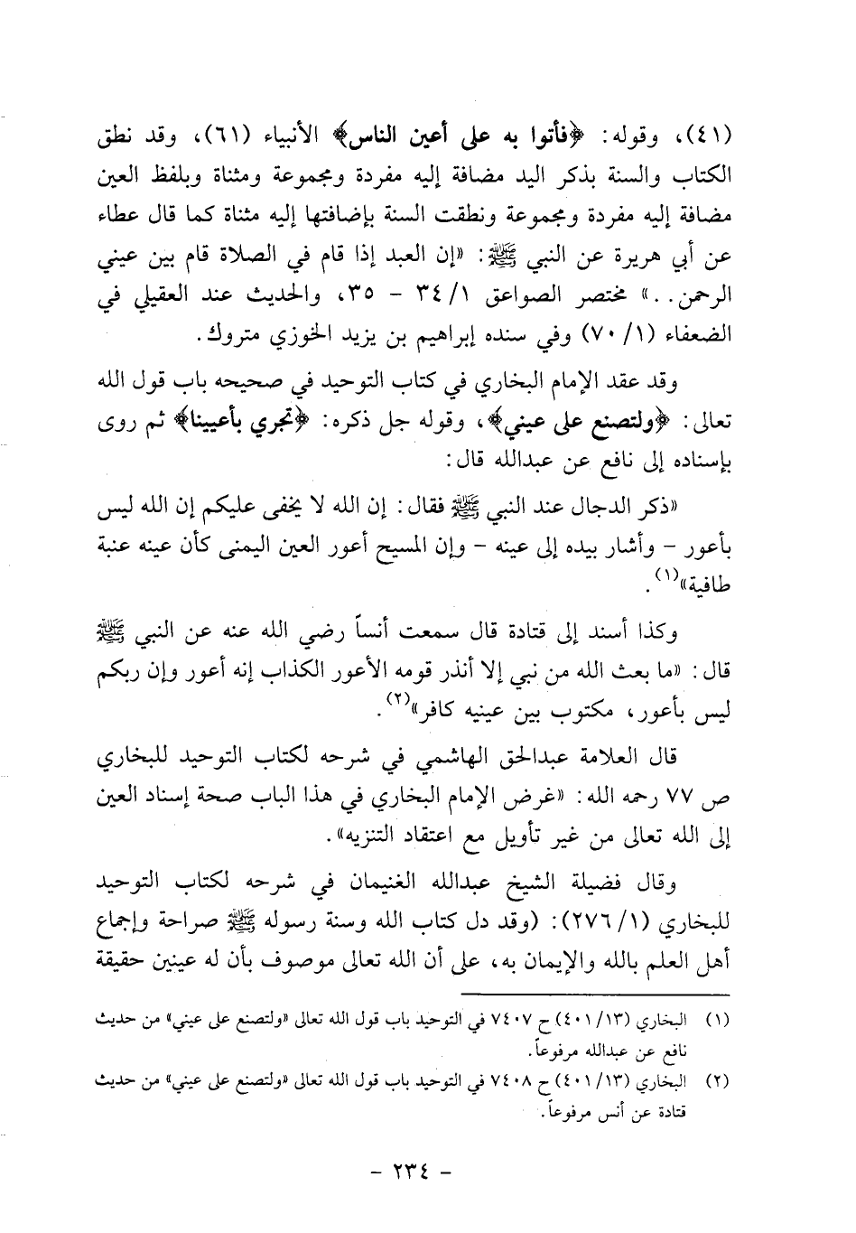 قال العلامة عبد الحق الهاشمي في شرحه لكتاب التوحيد للبخاري ص 77 رحمه الله: "غرض الإمام البخاري في هذا الباب صحة إسناد العين إلى الله تعالى من غير تأويل مع اعتقاد التنزيه ".