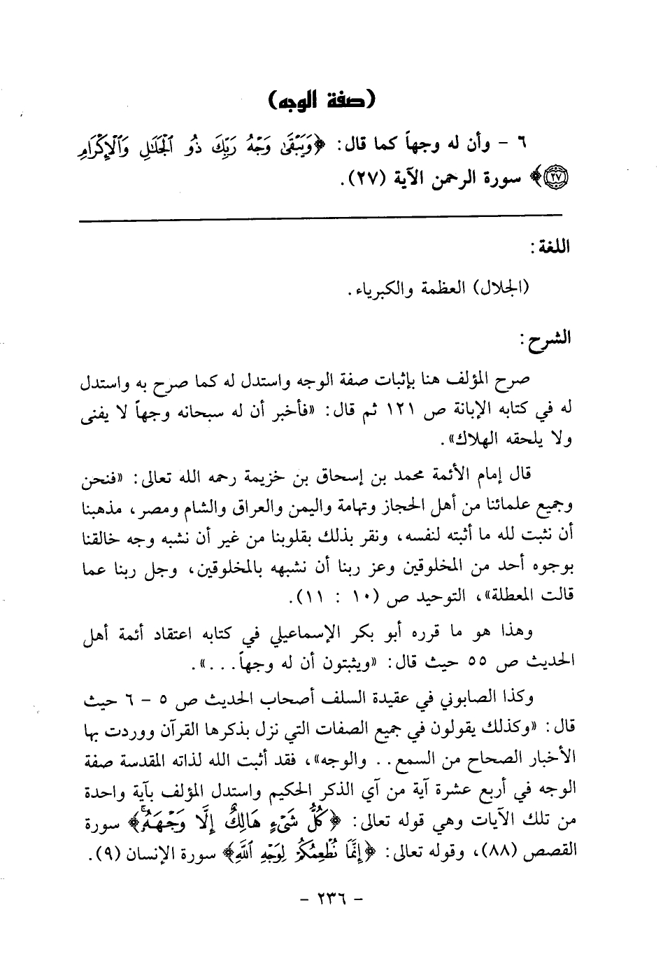 صرح المؤلف هنا بإثبات صفة الوجه واستدل له كما صرح به واستدل له في كتابه الإبانة ص 121 ثم قال: "فأخبر أن له سبحانه وجهاً لا يفنى ولا يلحقه الهلاك".