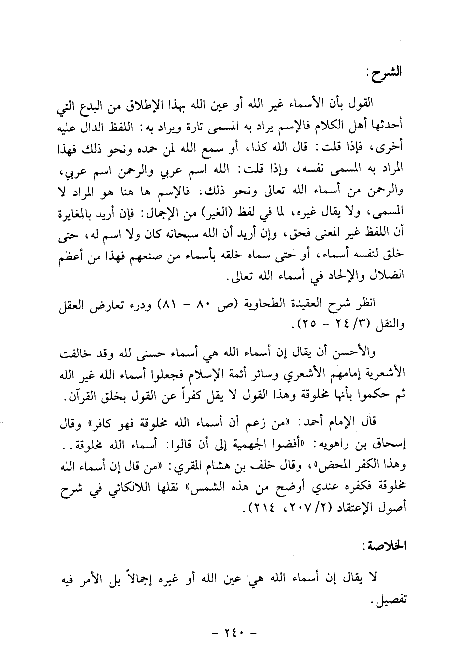 والأحسن أن يقال إن أسماء الله هي أسماء حسنى لله وقد خالفت الأشعرية إمامهم الأشعري وسائر أئمة الإسلام فجعلوا أسماء الله غير الله ثم حكموا بأنها مخلوقة وهذا القول لا يقل كفراً عن القول بخلق القرآن.