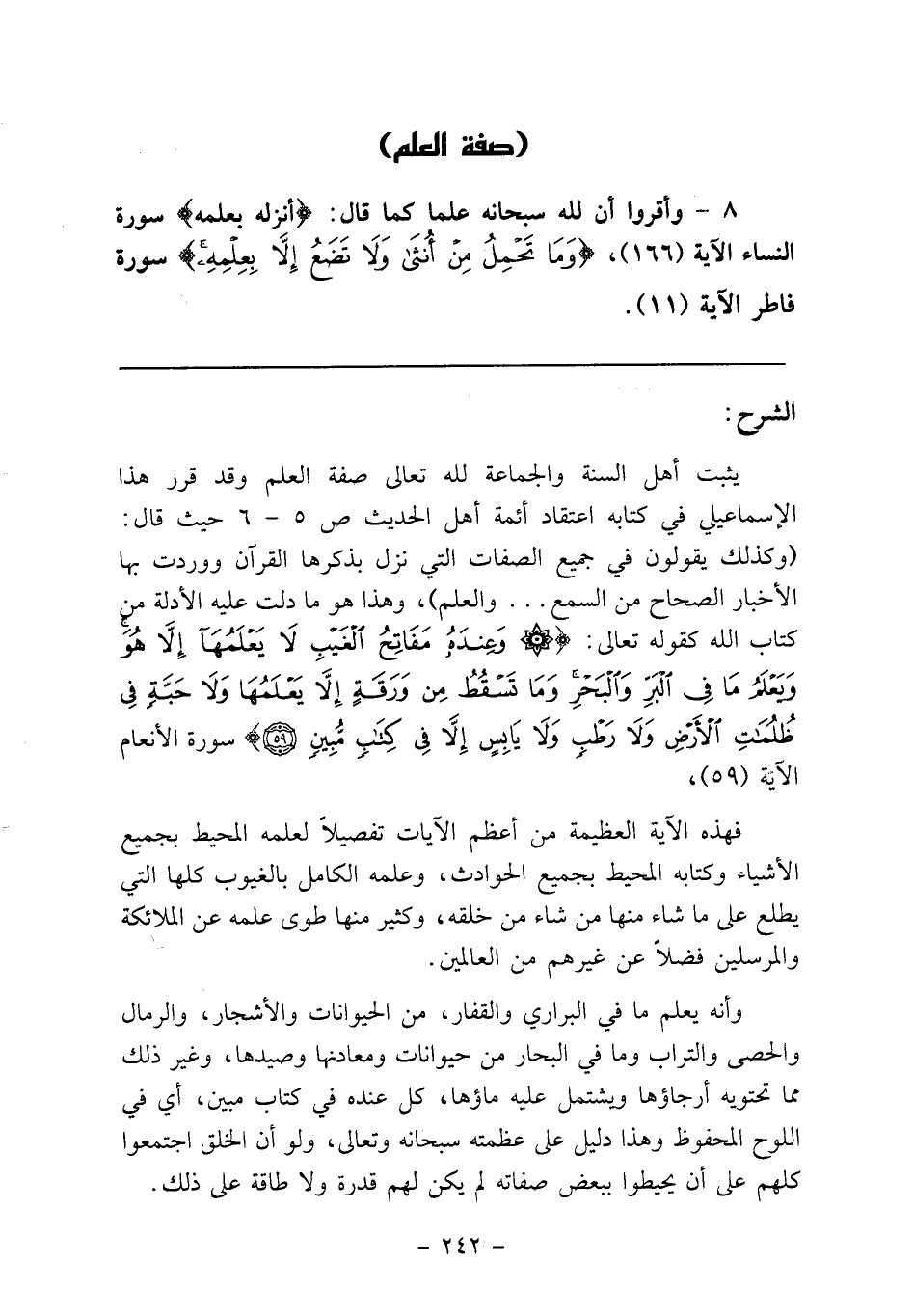 8- وأقروا أن لله سبحانه علما كما قال: {أَنْزَلَهُ بِعِلْمِهِ} سورة النساء الآية (166) ، {وَمَا تَحْمِلُ مِنْ أُنْثَى وَلا تَضَعُ إِلا بِعِلْمِهِ} سورة فاطر الآية (11) .